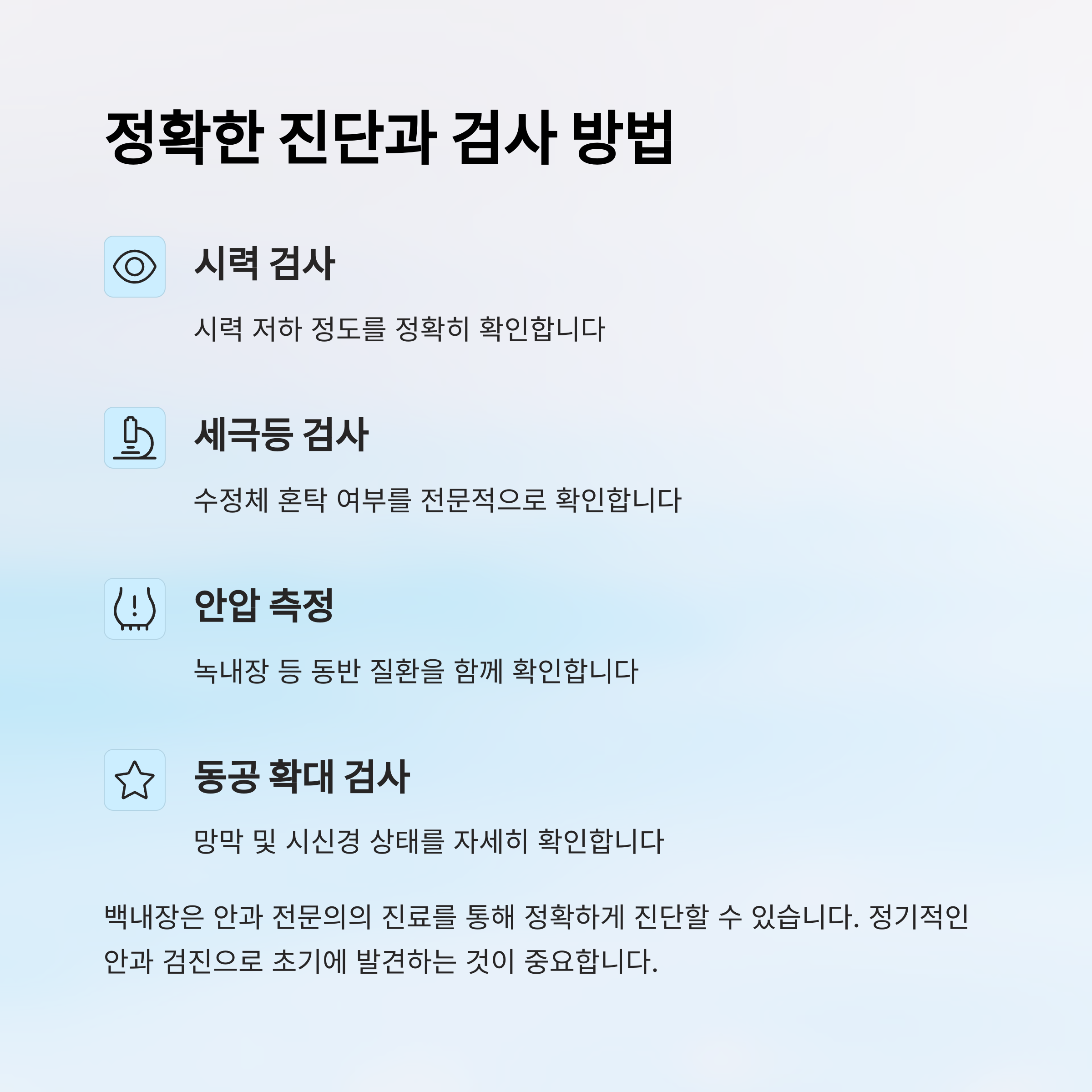 백내장은 안과 전문의의 진료를 통해 정확하게 진단할 수 있습니다. 주요 검사 방법은 다음과 같습니다.