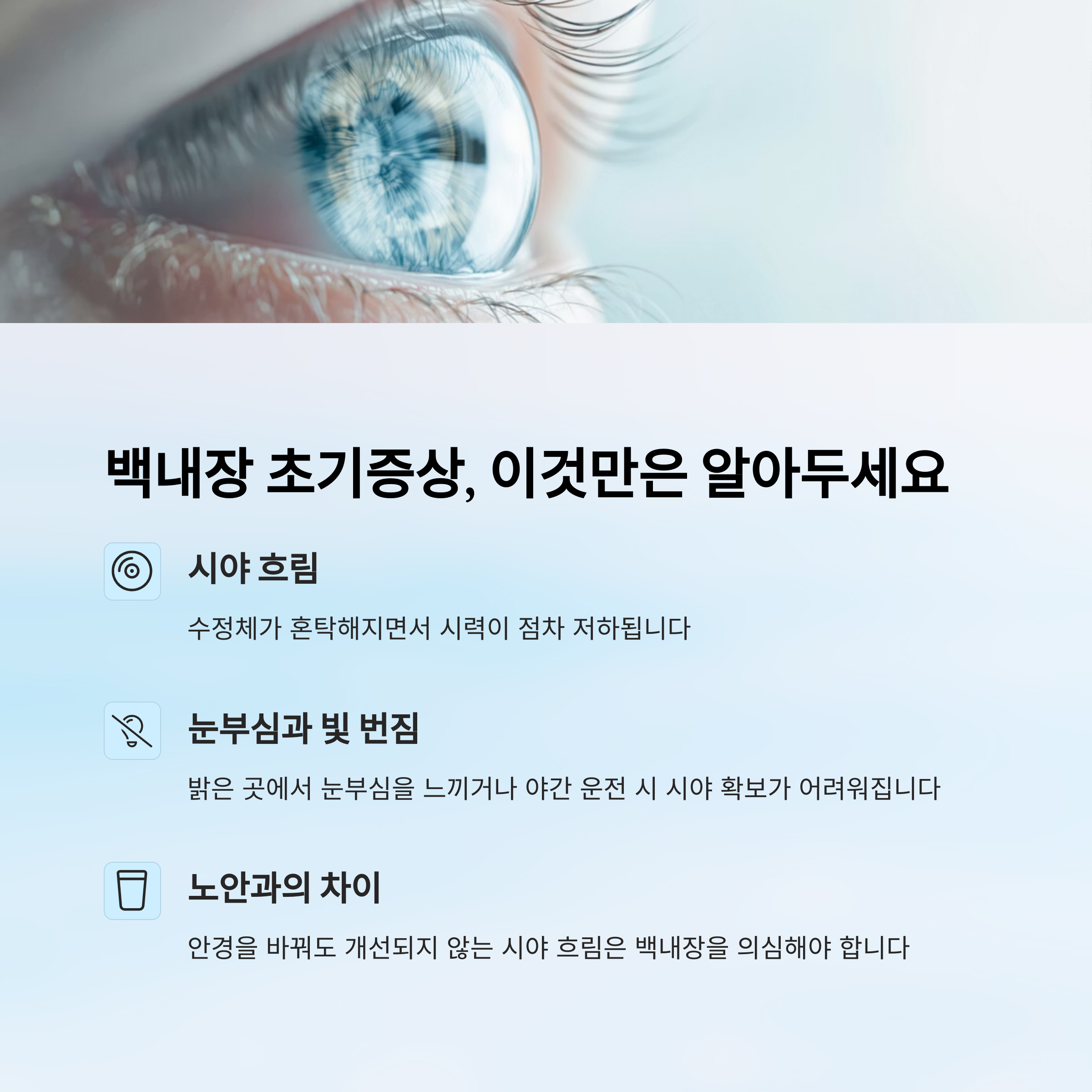 특히 뿌연 시야나 눈부심 등의 증상이 반복된다면 반드시 점검이 필요합니다.