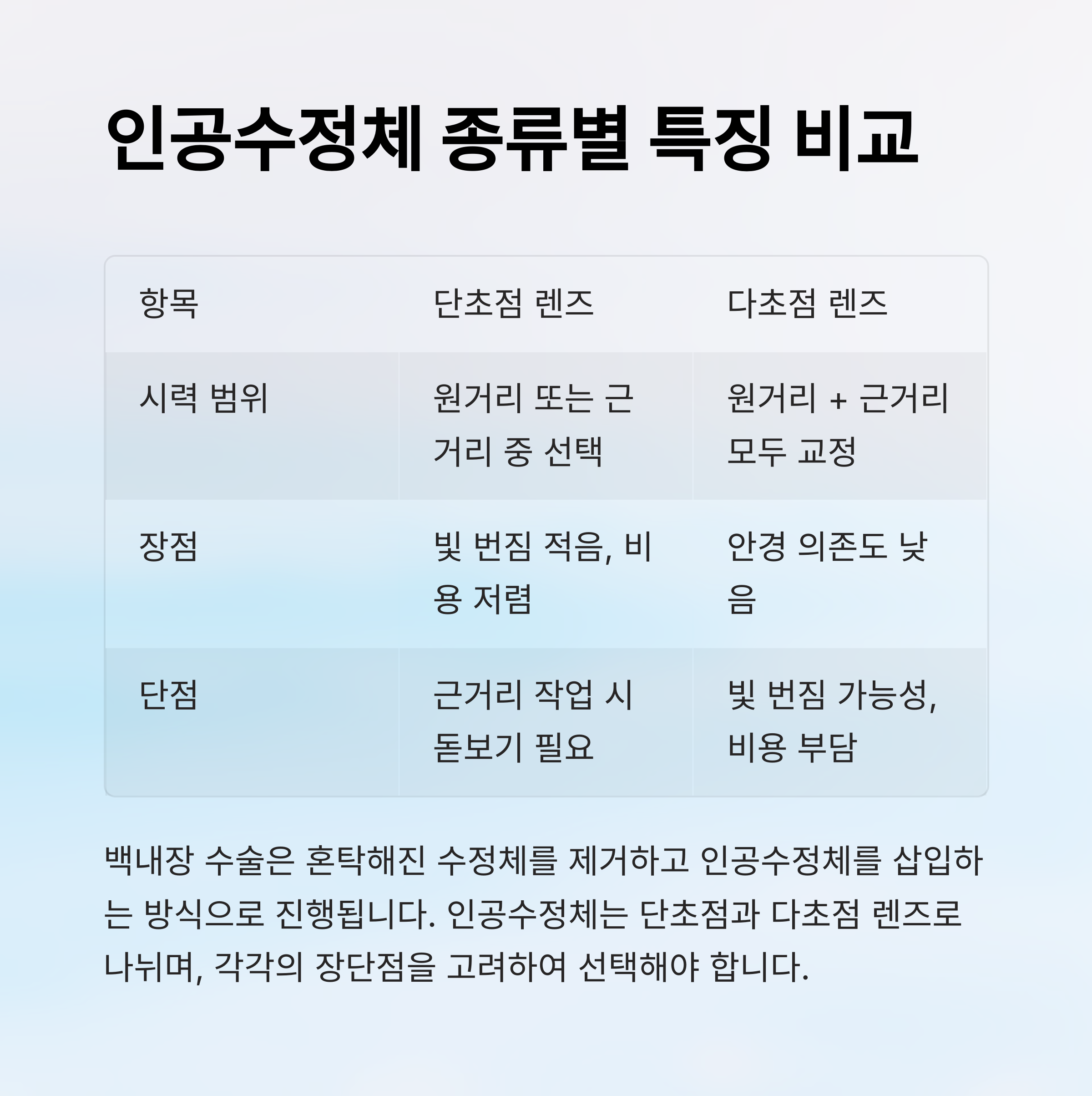 백내장 치료는 기본적으로 수술 중심이며, 사용하는 인공수정체의 종류에 따라 차이가 있습니다. 아래 표는 주요 치료 옵션을 비교한 내용입니다.
