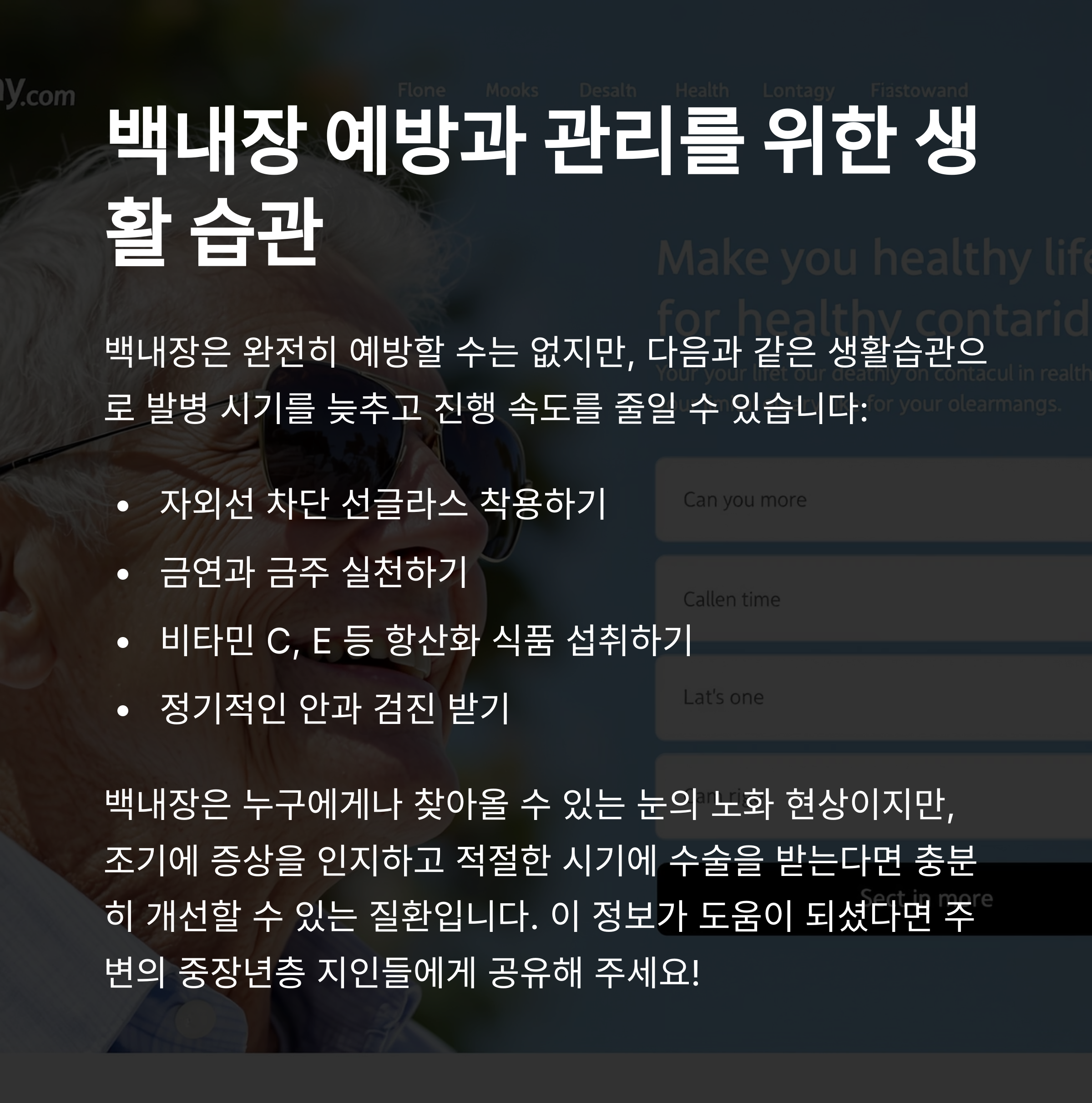 백내장은 완전히 예방할 수는 없지만, 다음과 같은 생활습관으로 발병 시기를 늦추고 진행 속도를 줄일 수 있습니다.