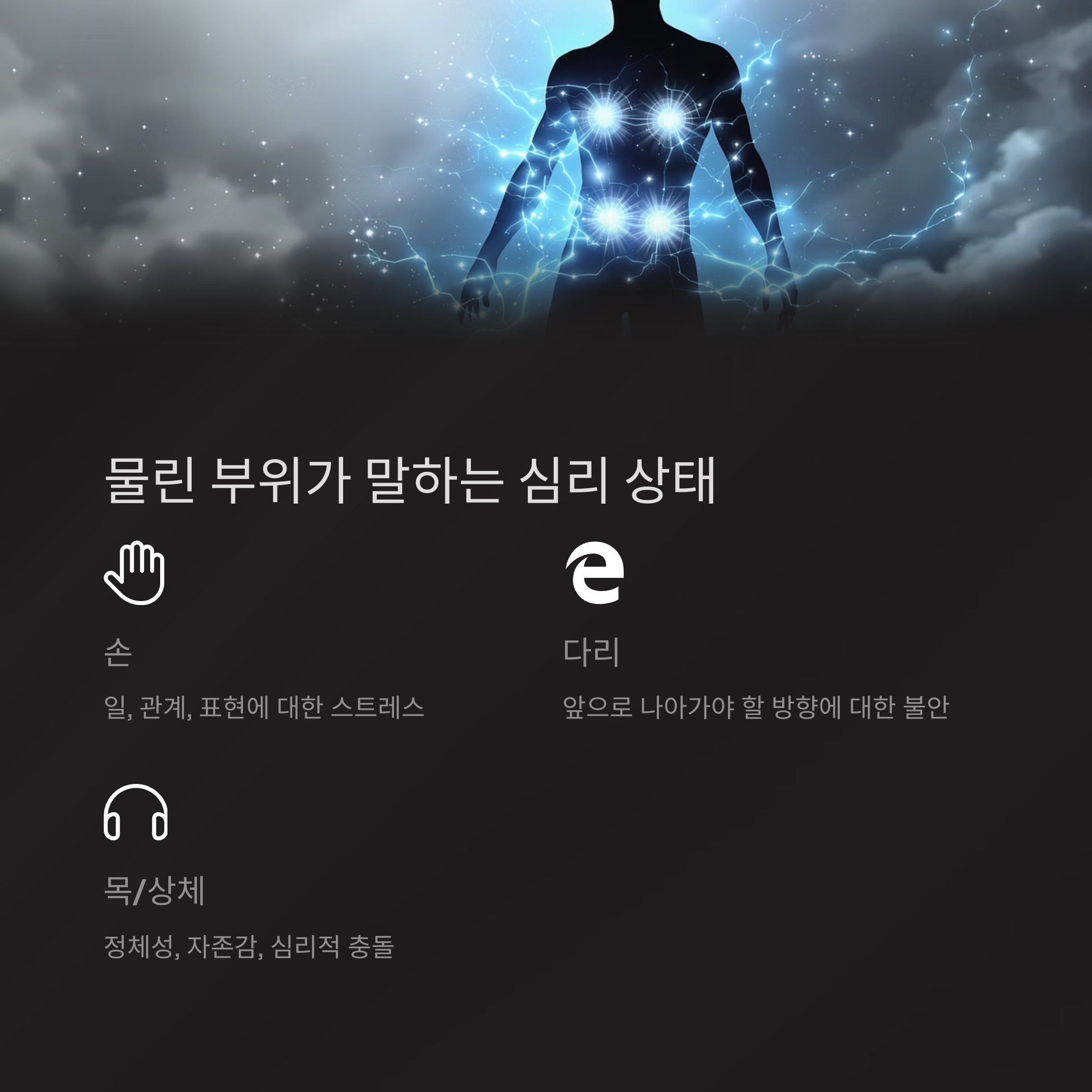 | 목/상체 | 정체성, 자존감, 심리적 충돌 |