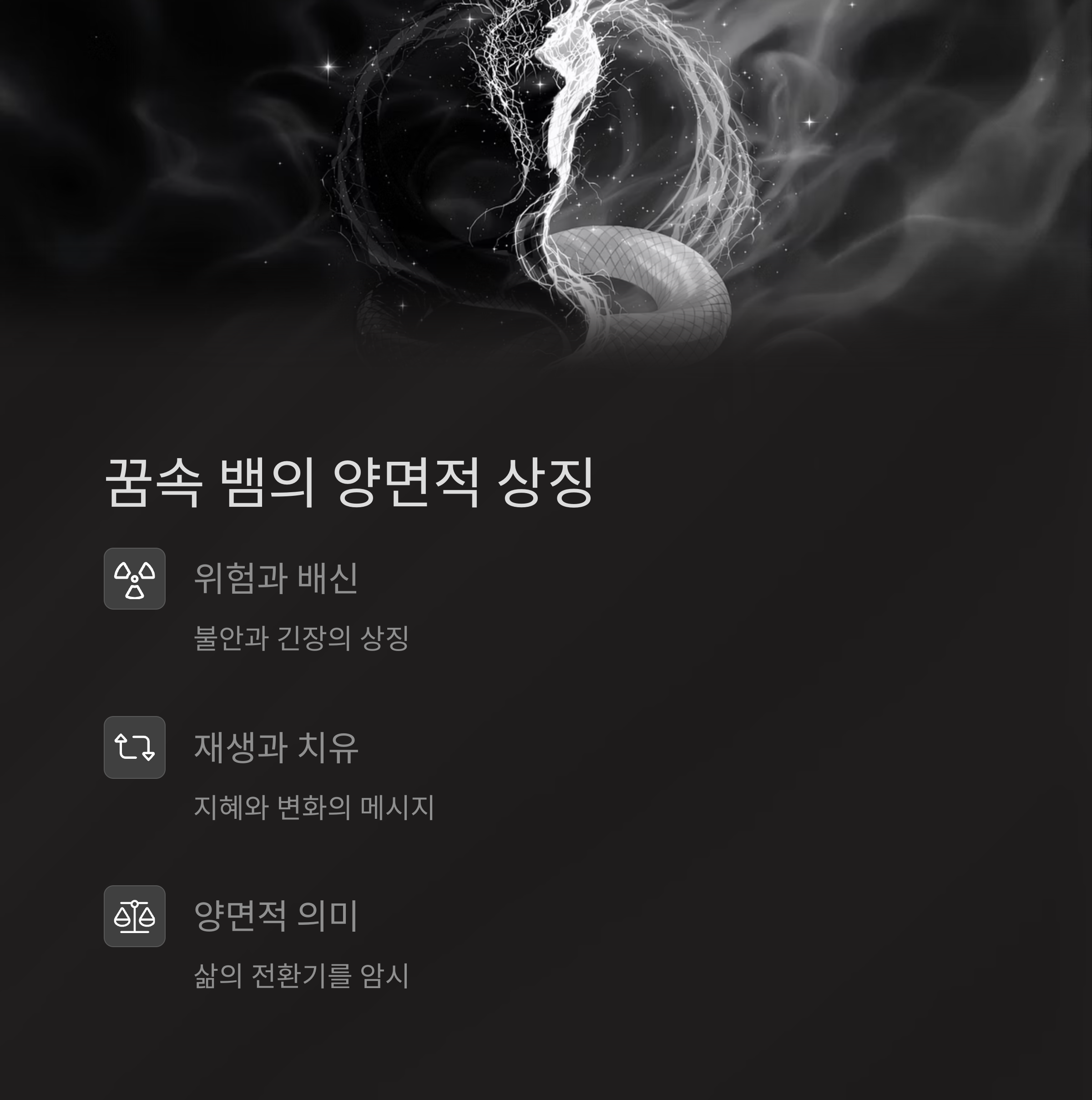 뱀은 꿈에서 매우 강력한 상징성을 지닌 존재입니다. 고대부터 뱀은 두 얼굴을 가진 상징이었어요. 한편으로는 위험과 유혹, 배신의 이미지로 여겨지지만, 다른 한편으로는 재생, 치유, 지혜, 성(性)의 상징으로도 해석됩니다. 그래서 뱀이 등장하는 꿈은 대개 '양면적인 메시지'를 품고 있습니다. 현재 당신이 느끼는 불안이나 긴장, 또는 삶의 전환기에 서 있다는 암시일 수 있습니다.