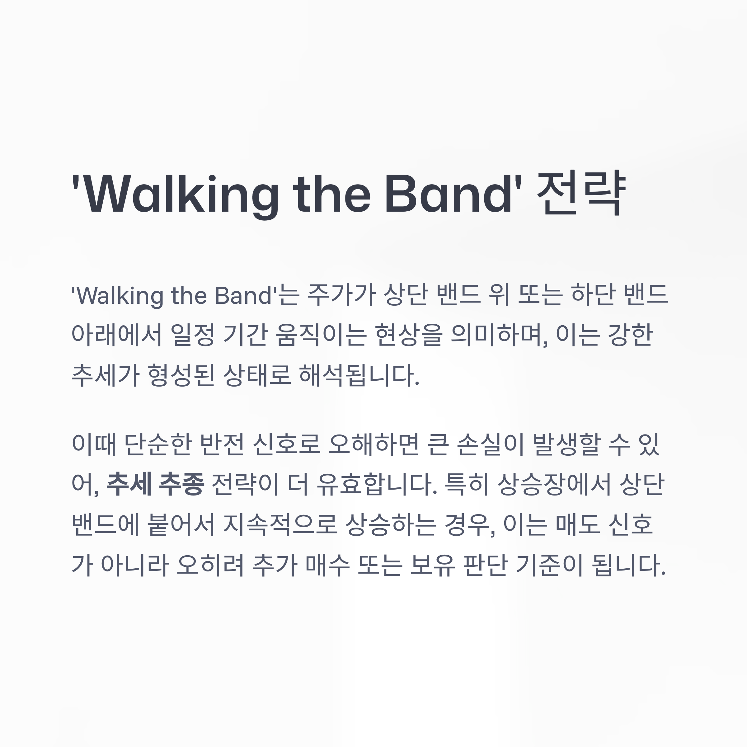 ‘Walking the Band’는 주가가 상단 밴드 위 또는 하단 밴드 아래에서 일정 기간 움직이는 현상을 의미하며,