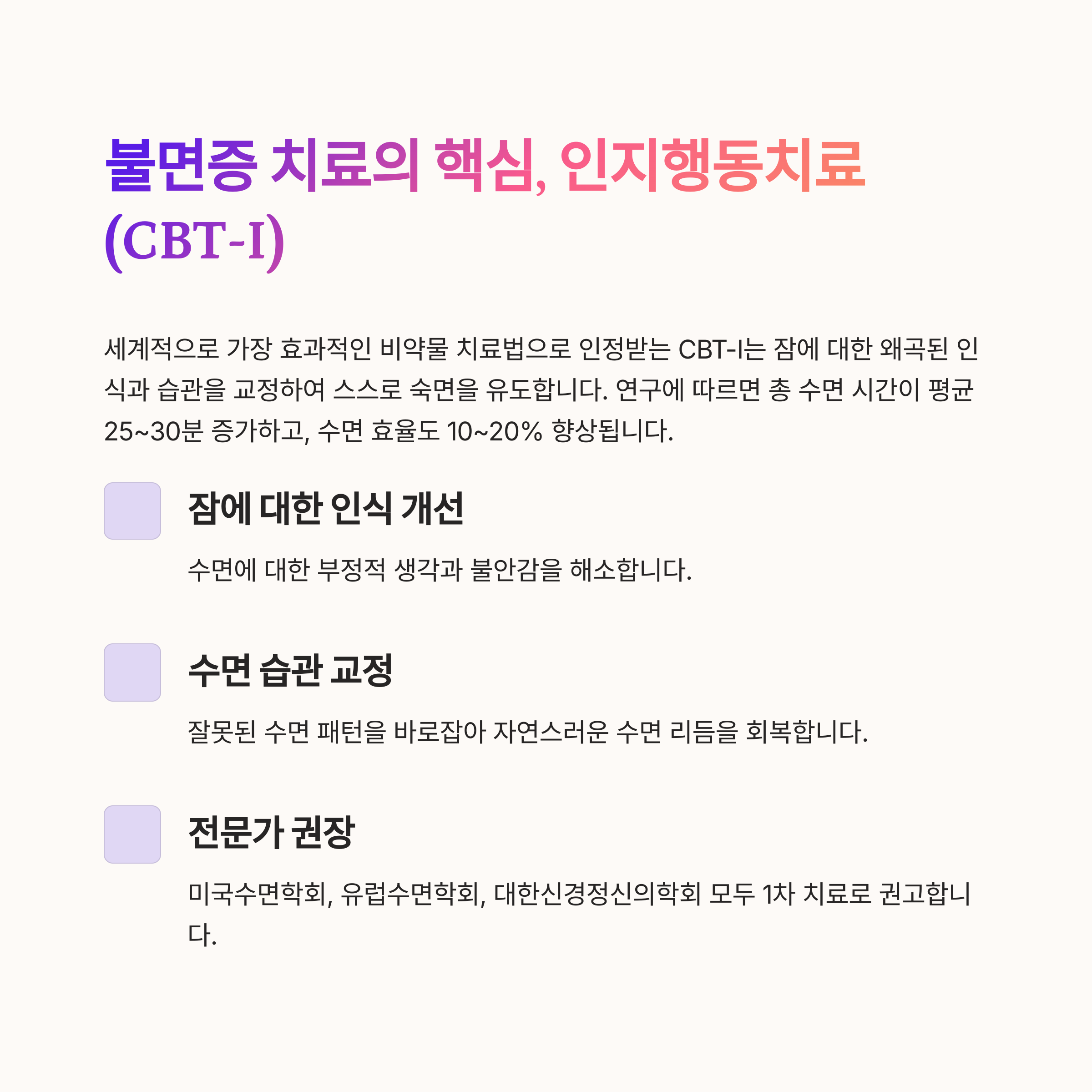 인지행동치료(Cognitive Behavioral Therapy for Insomnia, CBT-I)는 세계적으로 가장 효과적인 불면증 비약물 치료법으로 자리잡고 있습니다. 미국수면학회와 유럽수면학회, 대한신경정신의학회까지도 모두 이 방법을 만성 불면증의 1차 치료로 권고하고 있습니다.