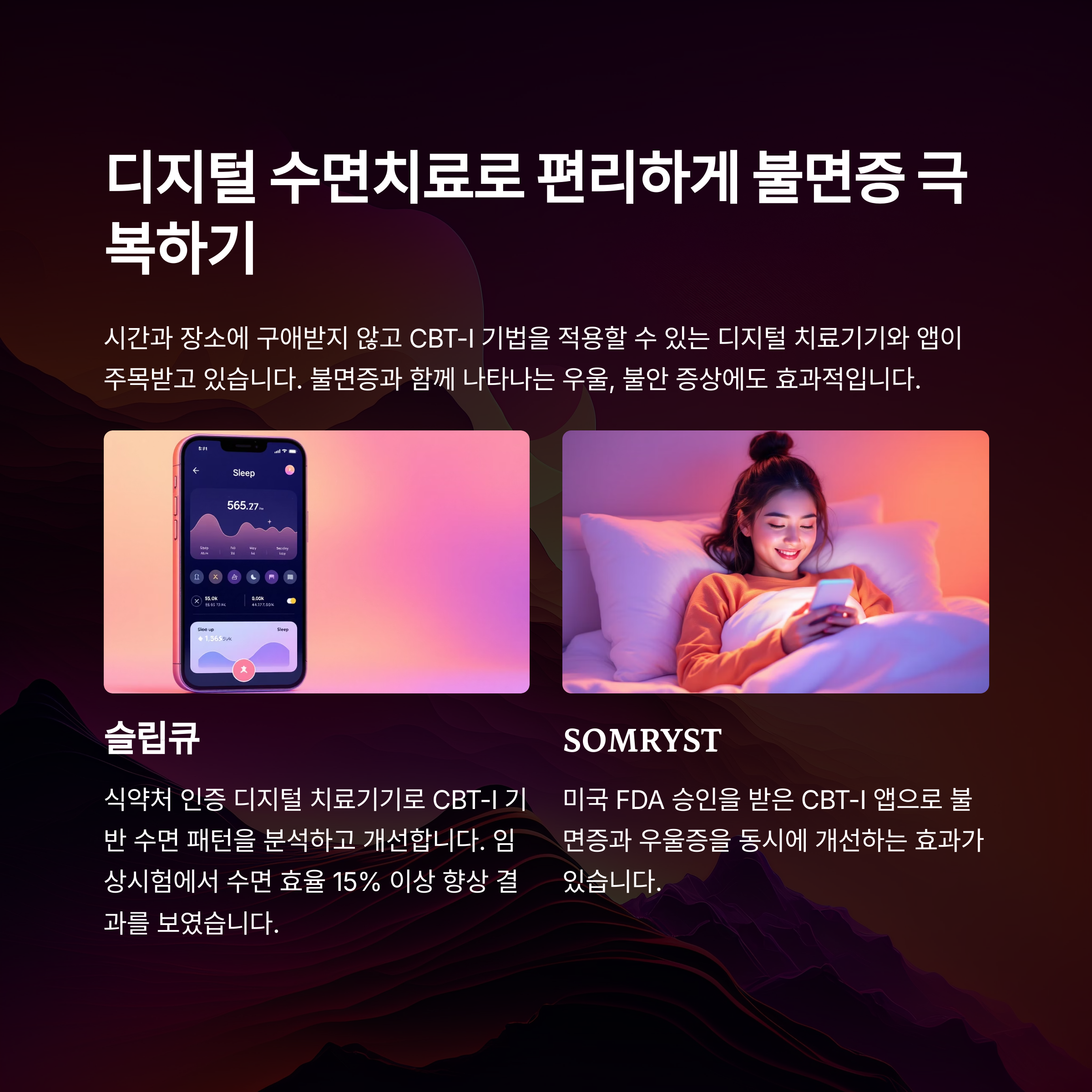 | SOMRYST | 미국 FDA 승인 CBT-I 앱, 불면증과 우울증 동시 개선 효과 |