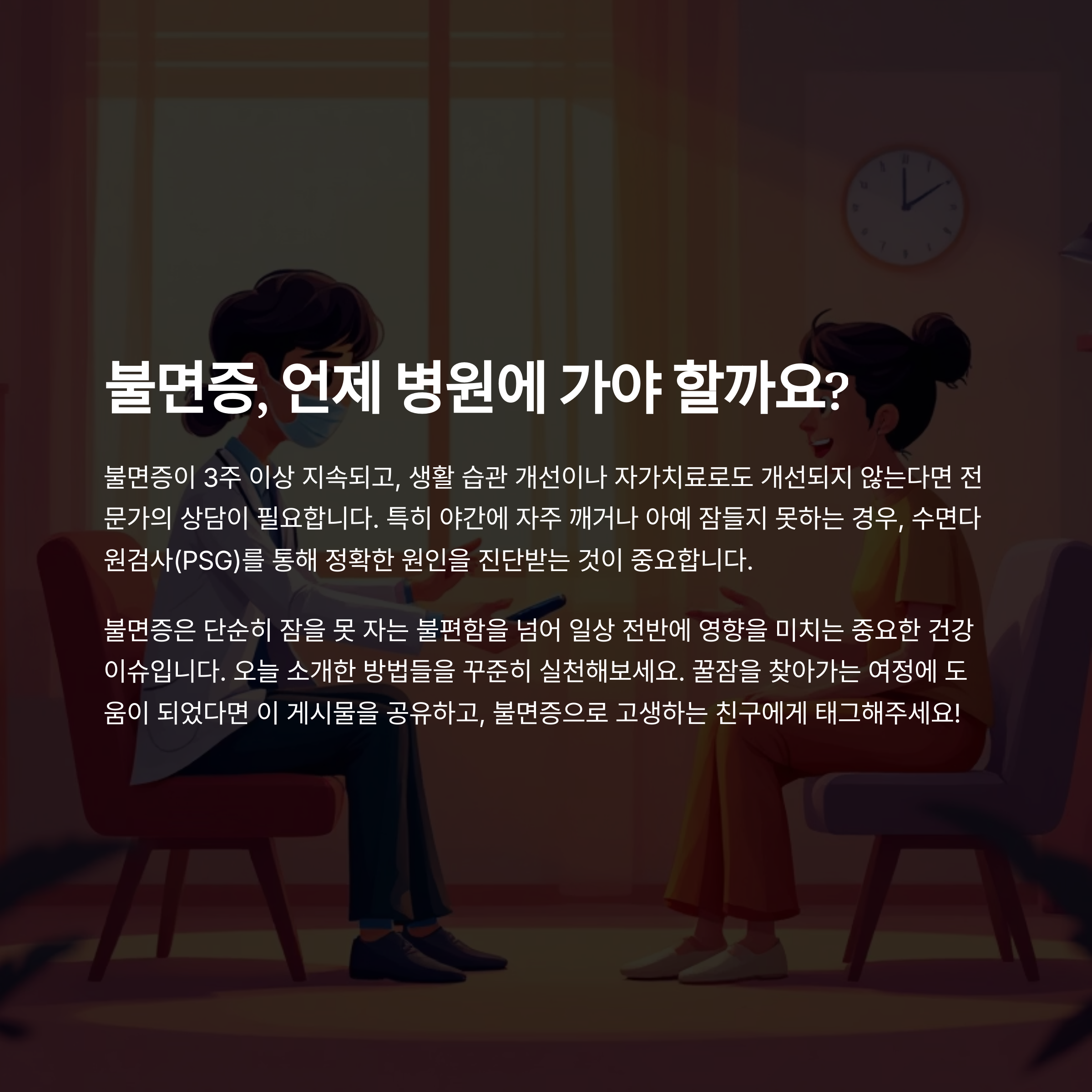 불면증이 3주 이상 지속되고, 생활 습관 개선이나 자가치료로도 개선되지 않는다면 반드시 전문가의 상담이 필요합니다. 특히 야간에 자주 깨거나 아예 잠들지 못하는 경우, 그 원인을 정확히 진단받는 것이 중요합니다.