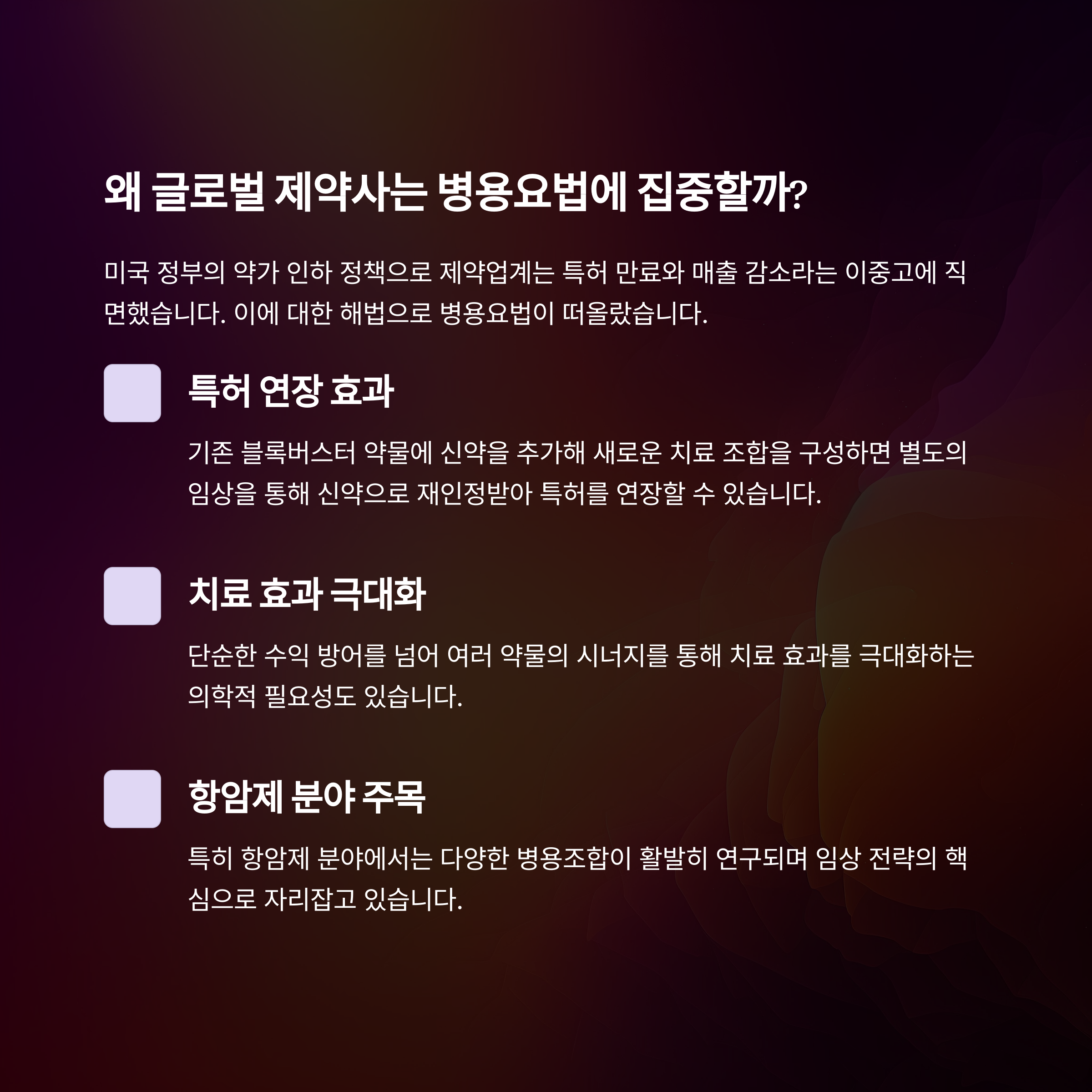 특히 미국 정부의 강력한 약가 인하 압박 속에서 글로벌 제약사, 이른바 빅파마들은 병용요법을 새로운 돌파구로 삼고 있는데요.