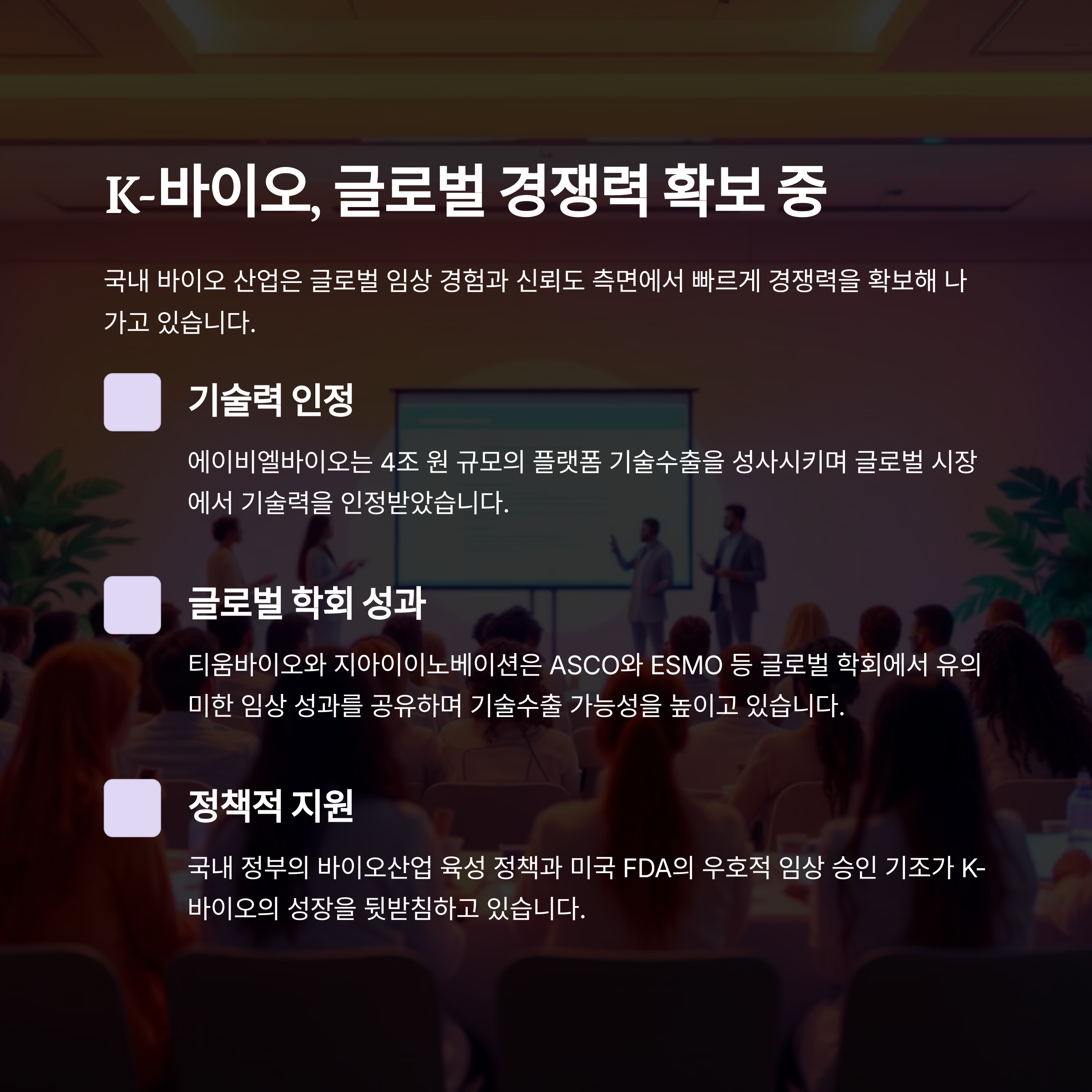 또한, 티움바이오와 지아이이노베이션은 ASCO와 ESMO 등 글로벌 학회에서 유의미한 임상 성과를 공유하며 기술수출 가능성을 높이고 있습니다.