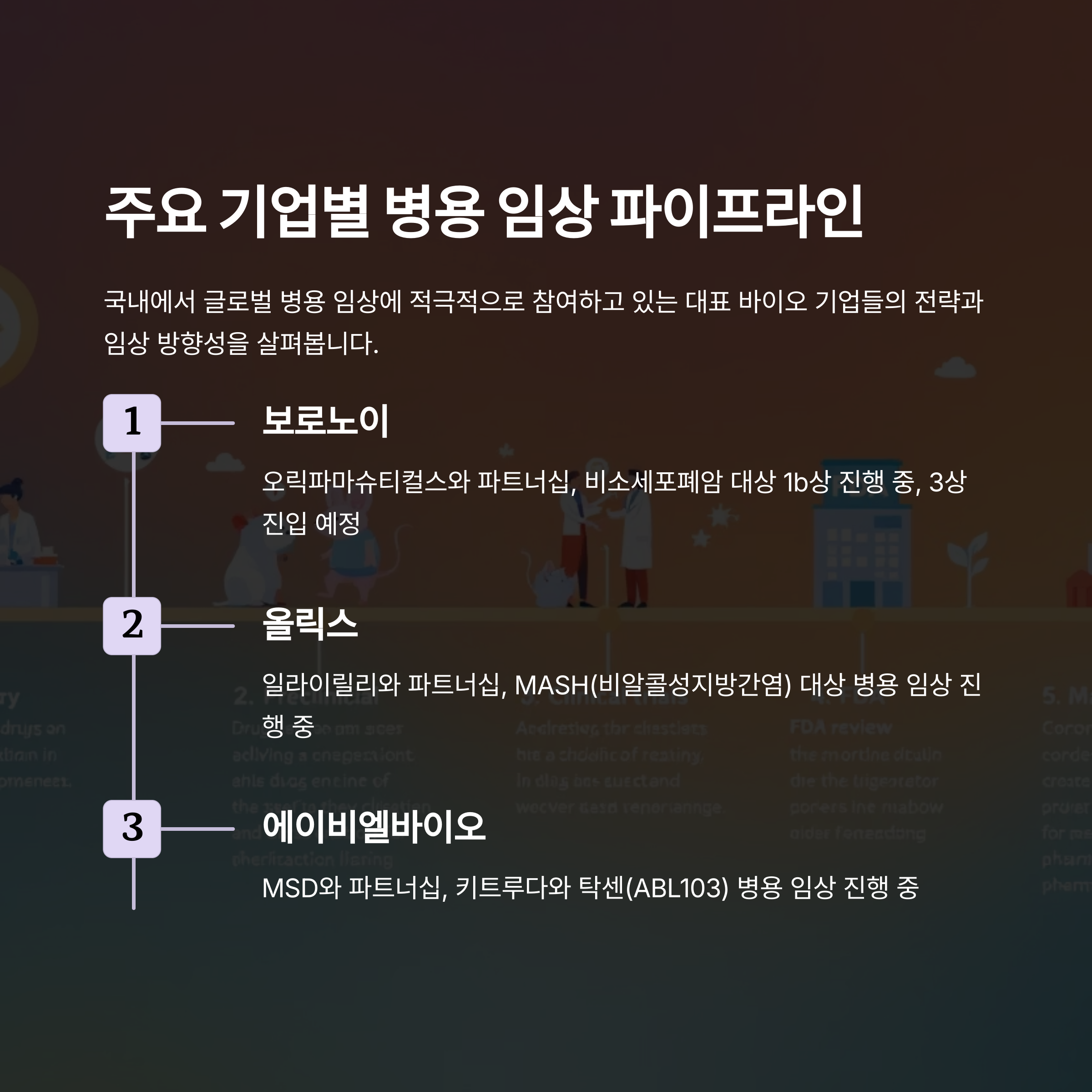 기존 블록버스터 의약품과의 병용 임상을 통해, 국내 기업들은 글로벌 협력의 중심으로 부상하고 있습니다.