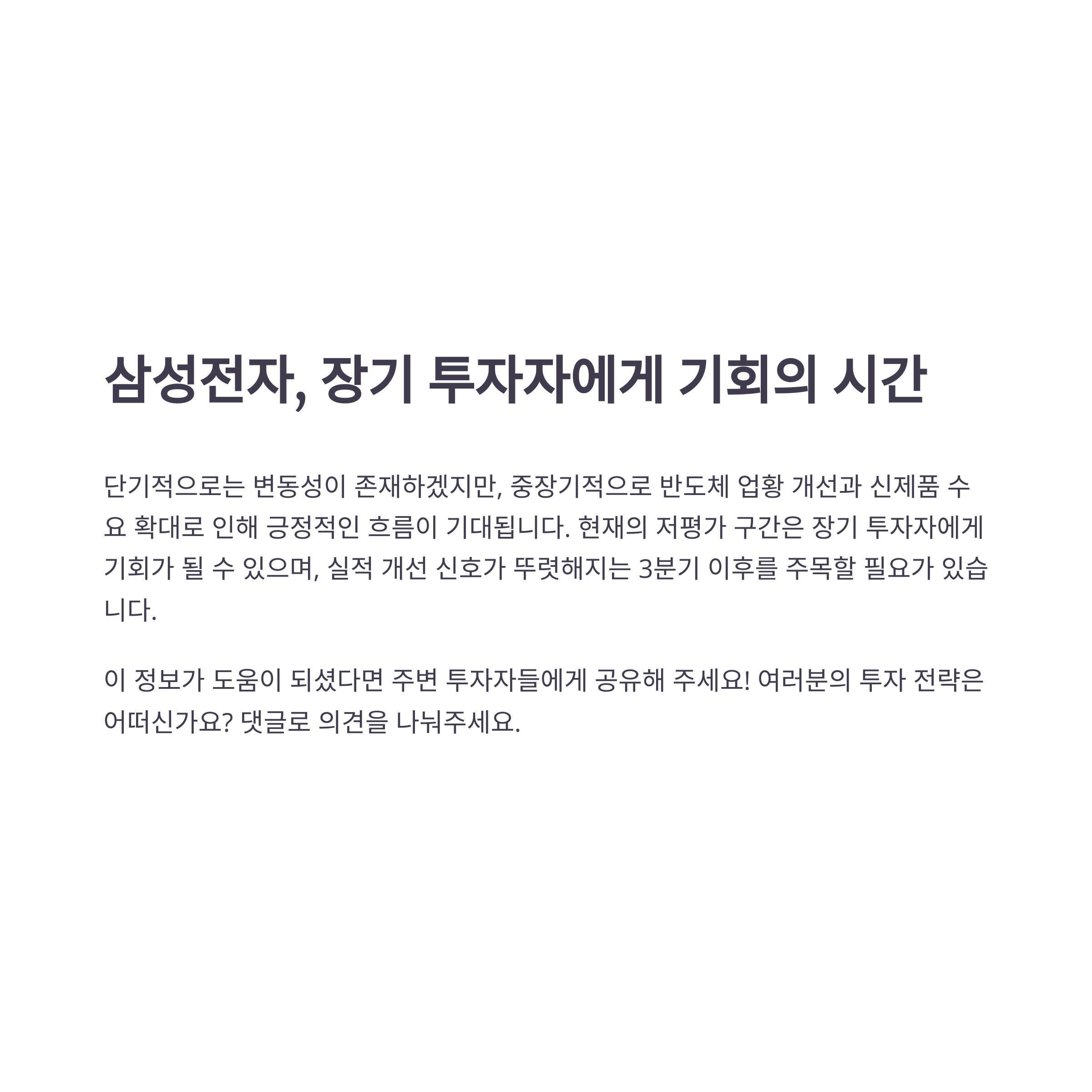 삼성전자의 견고한 재무구조, 현금 흐름, 그리고 기술 경쟁력을 감안할 때 현재의 주가는 장기 투자 관점에서 매력적이라는 의견이 지배적입니다.