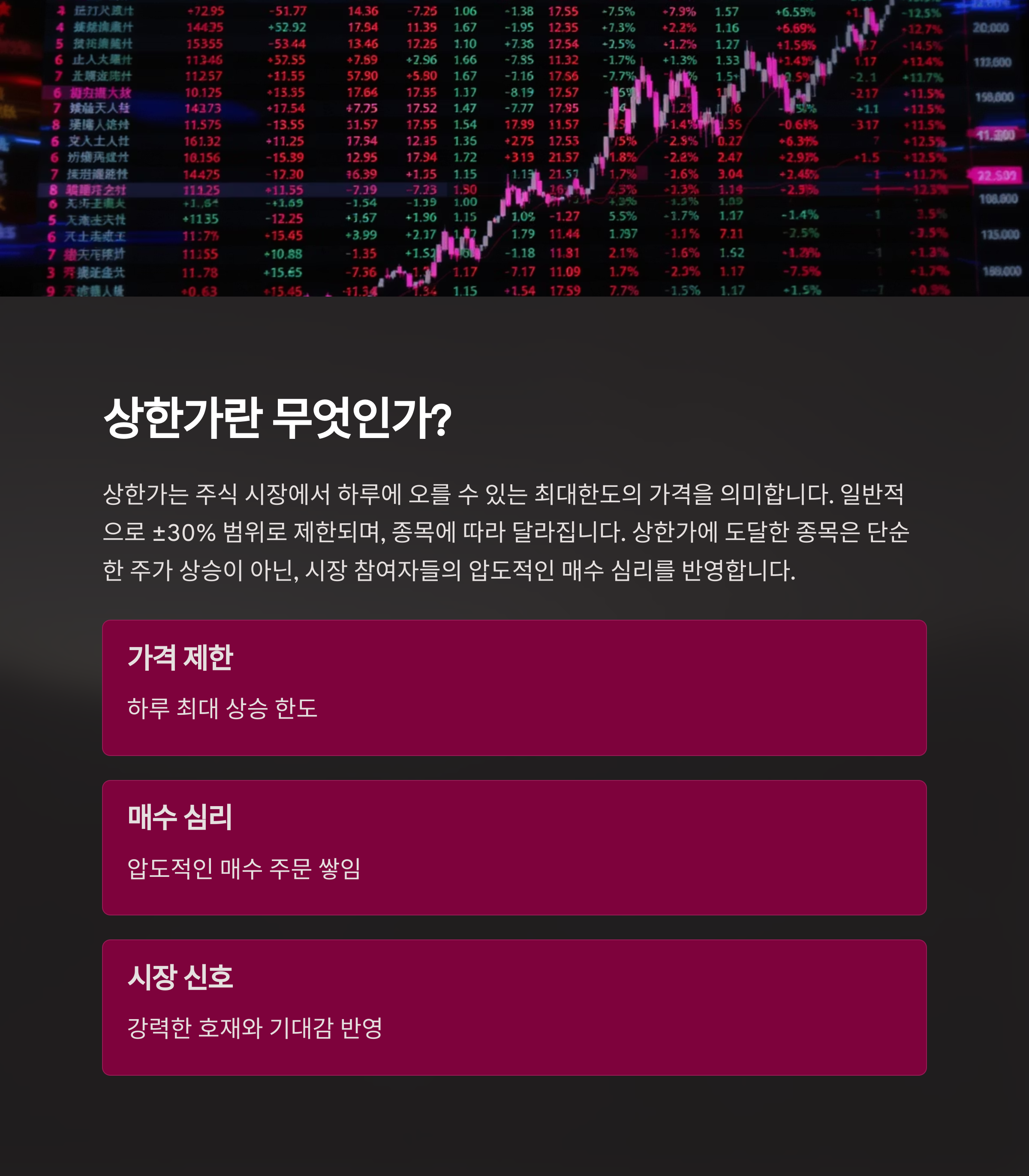 주식 시장에서 상한가란 단순한 급등이 아닌, 시장의 심리와 강력한 재료가 결합된 신호이기도 합니다.