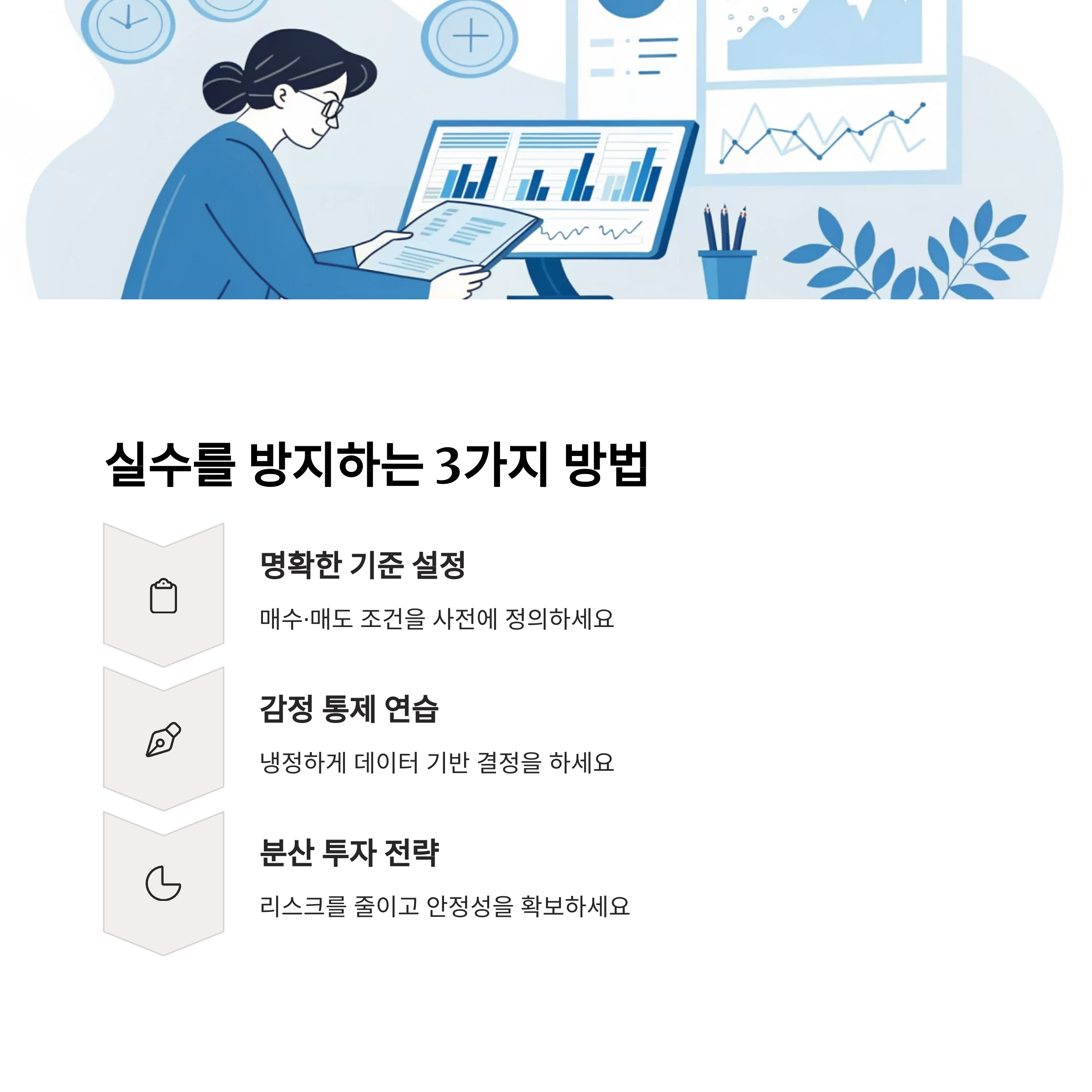 마지막으로 분산투자 미흡도 큰 실수 유형입니다. 한두 종목에만 올인하는 전략은 성공 시 수익이 크지만, 실패 시 회복이 불가능할 만큼 타격이 큽니다. 다양한 산업군과 리스크 등급의 종목을 나누어 자산을 분산 배치하면 전체 계좌의 안정성을 높일 수 있습니다. 실수는 누구나 할 수 있지만, 같은 실수를 반복하지 않기 위해선 유형별 특징과 대응 전략을 반드시 정리하고 내 것으로 만들어야 합니다.