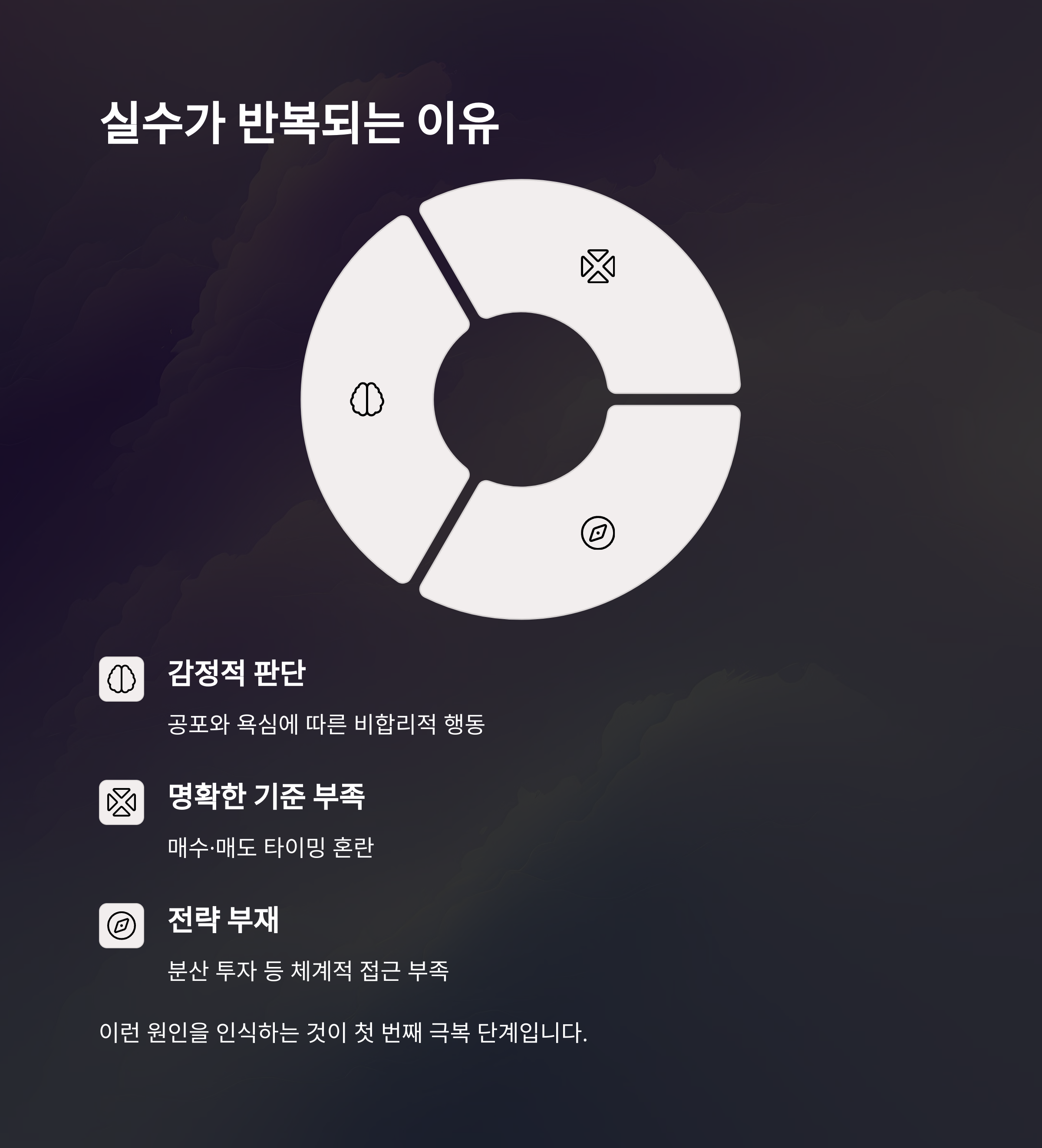 | 주식 실수란? | 투자 과정에서 정보 부족, 감정 개입 등으로 발생한 판단 오류입니다. |