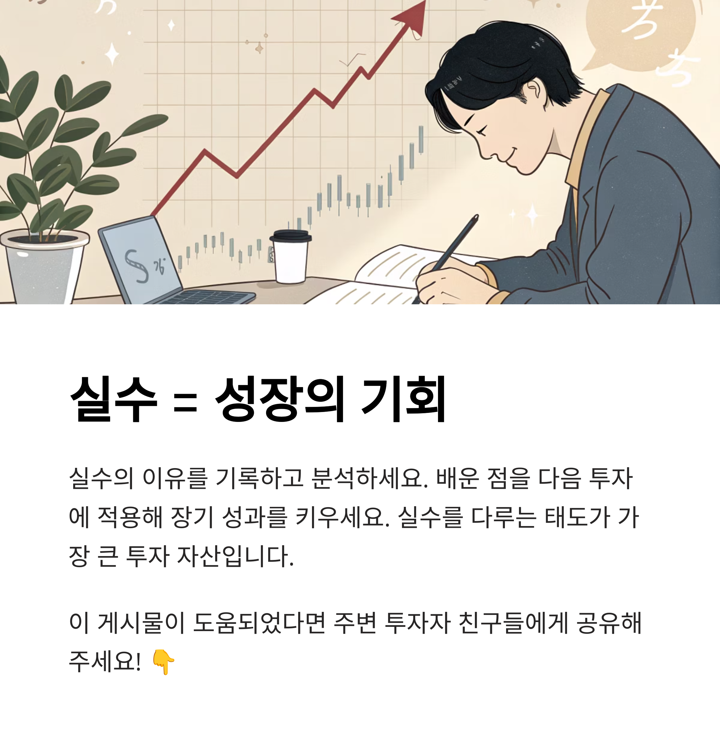 누구나 주식에서 실수합니다. 그 실수를 어떻게 다루느냐가 진짜 투자 실력을 결정합니다. 실수한 종목을 부끄러워하거나 외면하지 말고, 분석하고 기록하며 재발 방지 전략을 세우세요. 이 과정을 통해 얻은 교훈은 다음 투자에서 수익으로 이어지는 자산이 됩니다. 투자자는 실패를 통해 성장합니다. 여러분의 실수 또한 훌륭한 스승이 될 수 있습니다. 실수 없는 투자보다, 배우는 투자가 더 중요합니다.