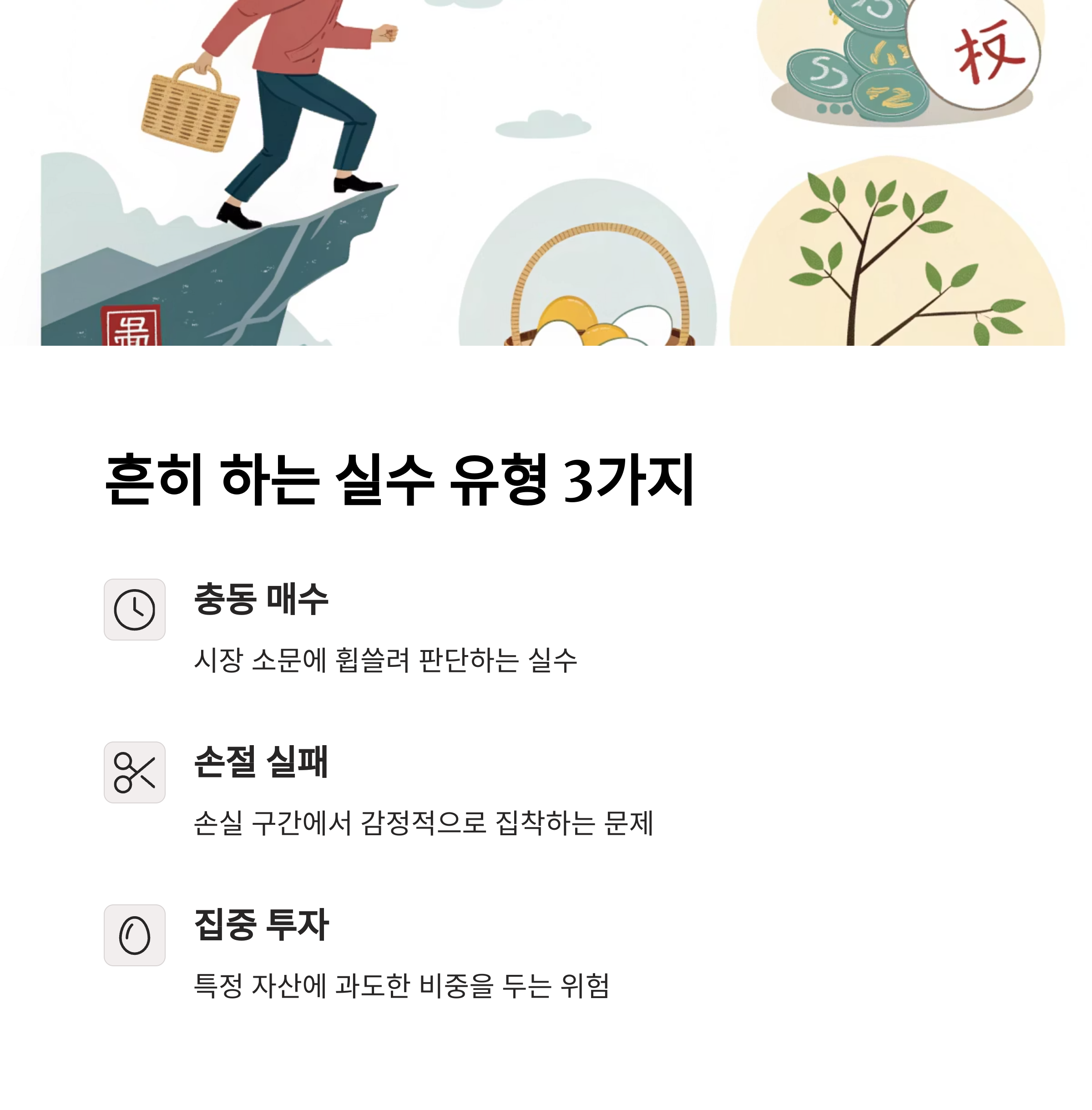 | 분석 없는 고점 진입은 가장 위험한 실수입니다. | 손절 기준이 없으면 피해가 커집니다. | 자산 전체를 한 종목에 몰아선 안 됩니다. |