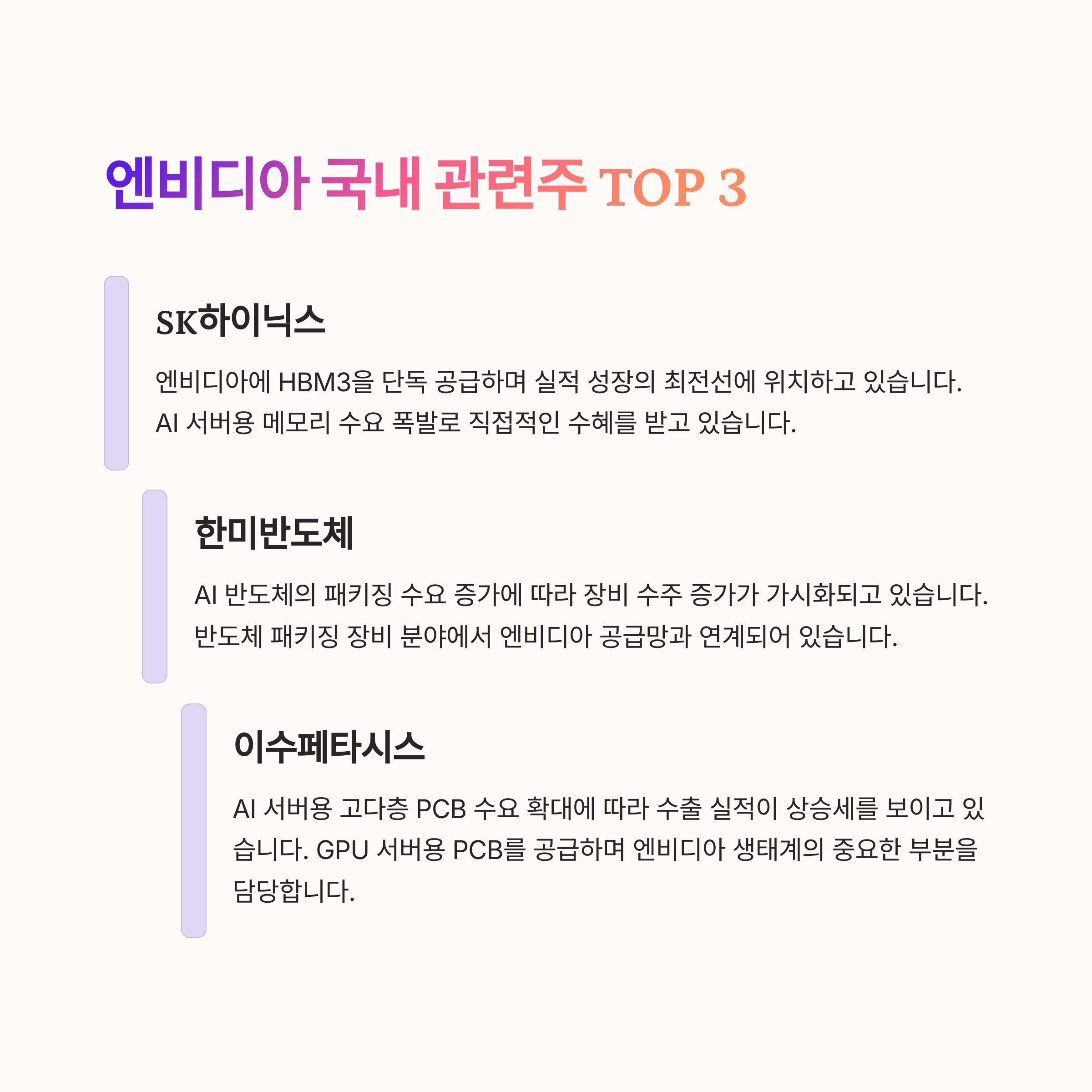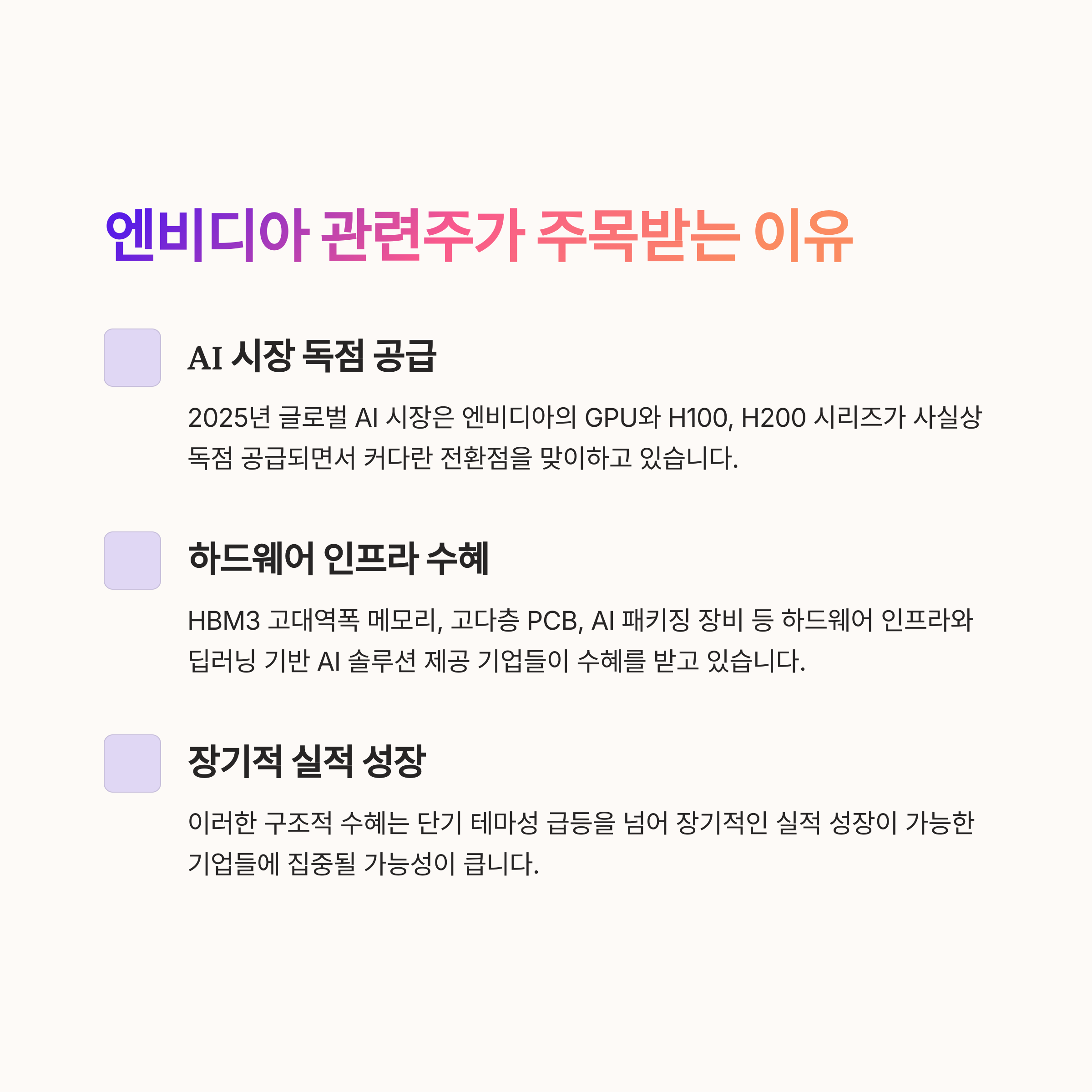 2025년 AI 반도체 시장이 본격화되면서 엔비디아의 GPU 수요가 급증하고 있으며, 국내 공급망에 포함된 기업들이 직접적인 수혜를 보고 있기 때문입니다.