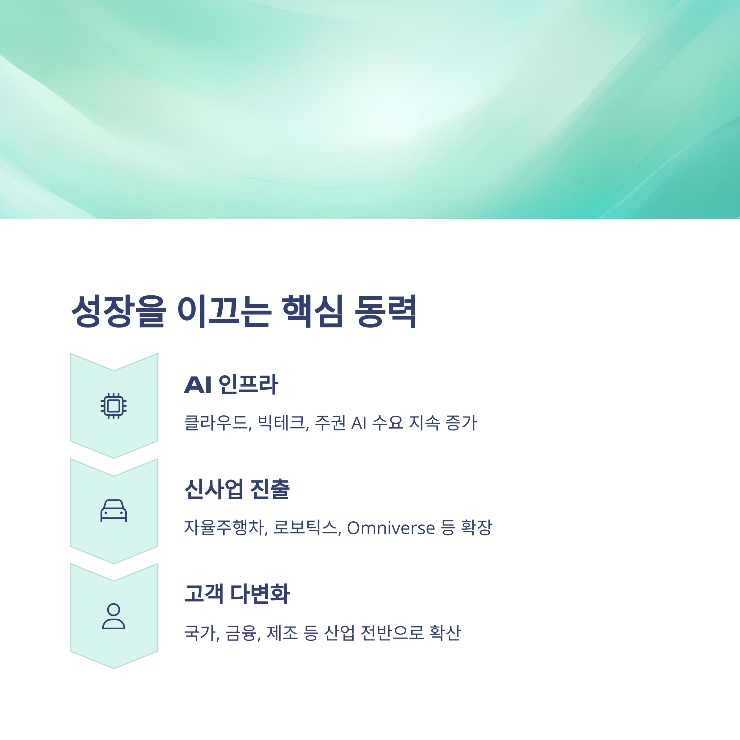 AI 연산 인프라, 자율주행차, 로보틱스, Omniverse(디지털 트윈) 등 미래 기술 전반에 걸친 사업 확장이 그 기반입니다.