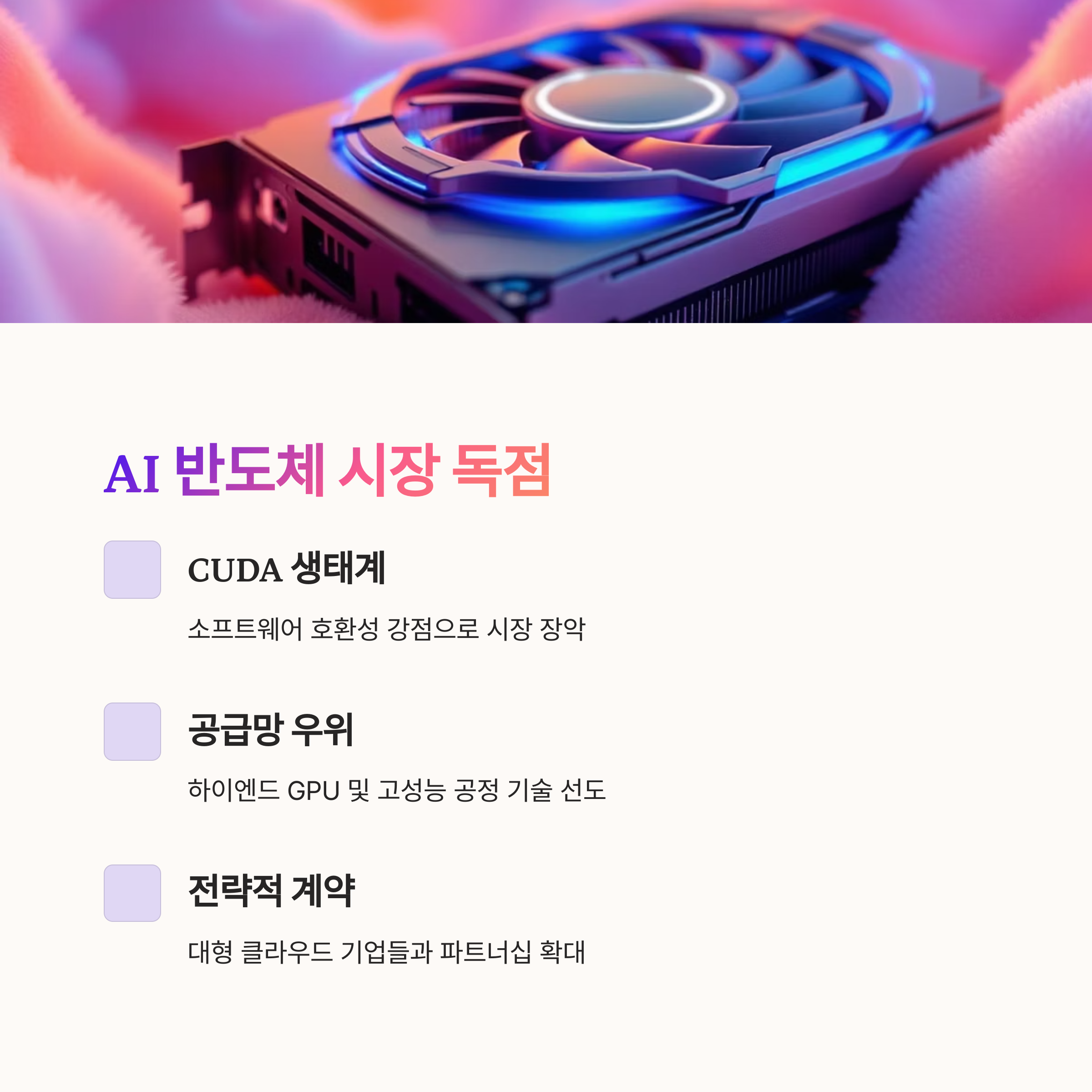 AI 연산에 최적화된 GPU 기술력, CUDA 생태계 독점, 빅테크와의 협력 구조 등 복합적인 요인이 있습니다.