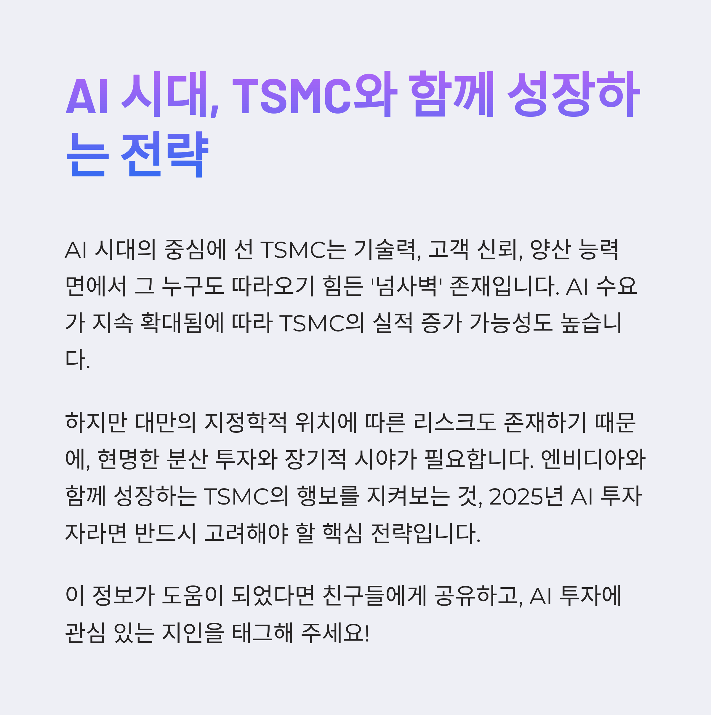 엔비디아와 함께 성장하는 TSMC의 행보를 지켜보는 것, 2025년 AI 투자자라면 반드시 고려해야 할 핵심 전략입니다.