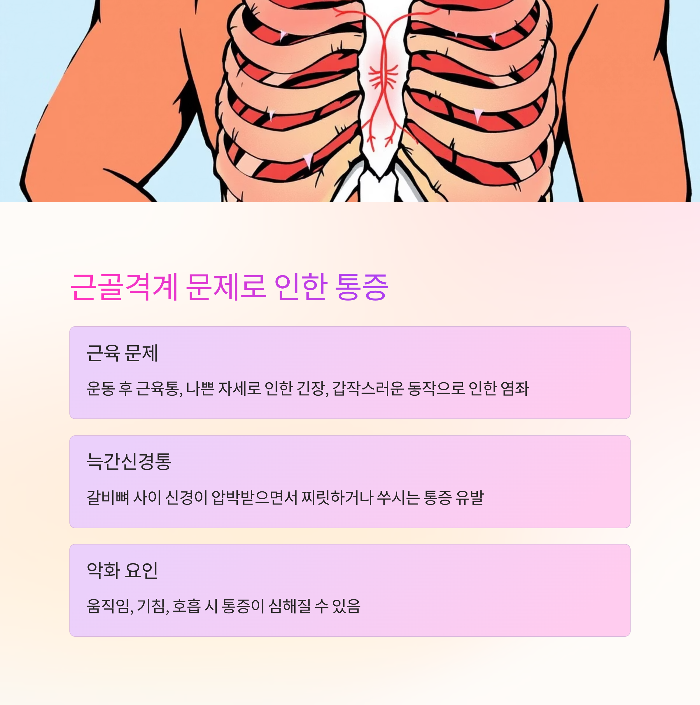 특히 늑간신경통은 갈비뼈 사이 신경이 압박을 받으면서 찌릿하거나 쑤시는 통증을 유발하며,