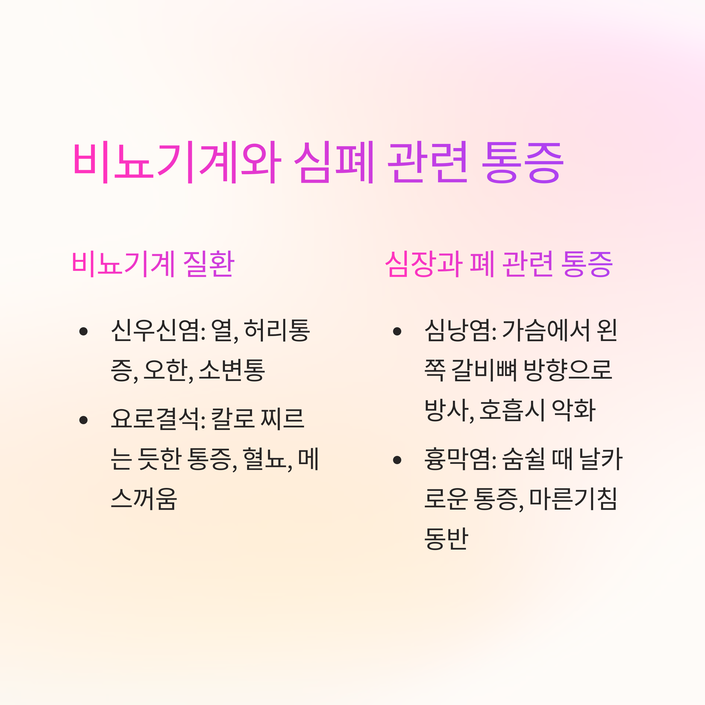 | 심낭염 | 가슴에서 왼쪽 갈비뼈 방향으로 방사, 호흡시 악화 |