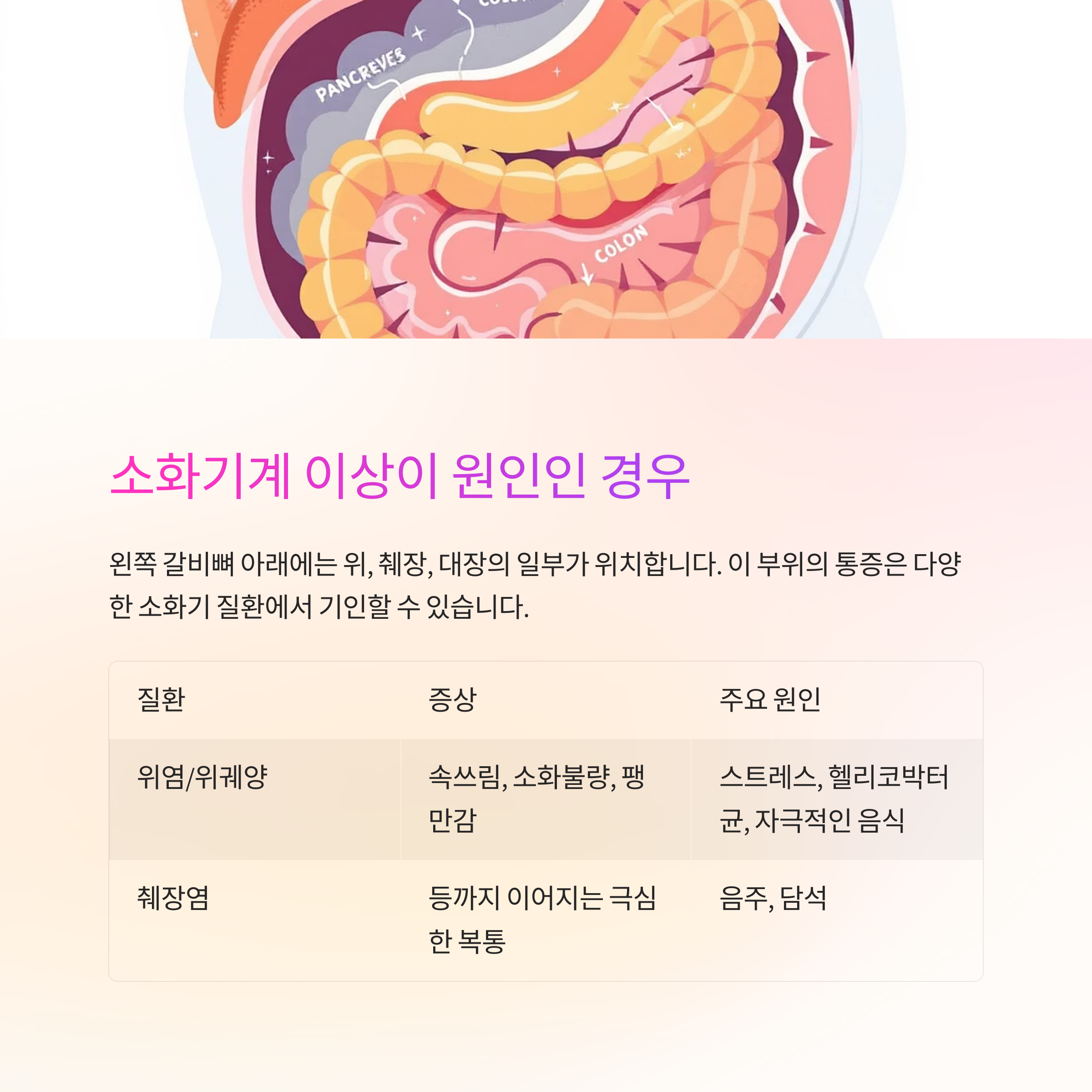 단순한 자세 불량에서 오는 근육 문제일 수도 있고, 위염이나 췌장염처럼 소화기관의 문제일 수도 있죠.