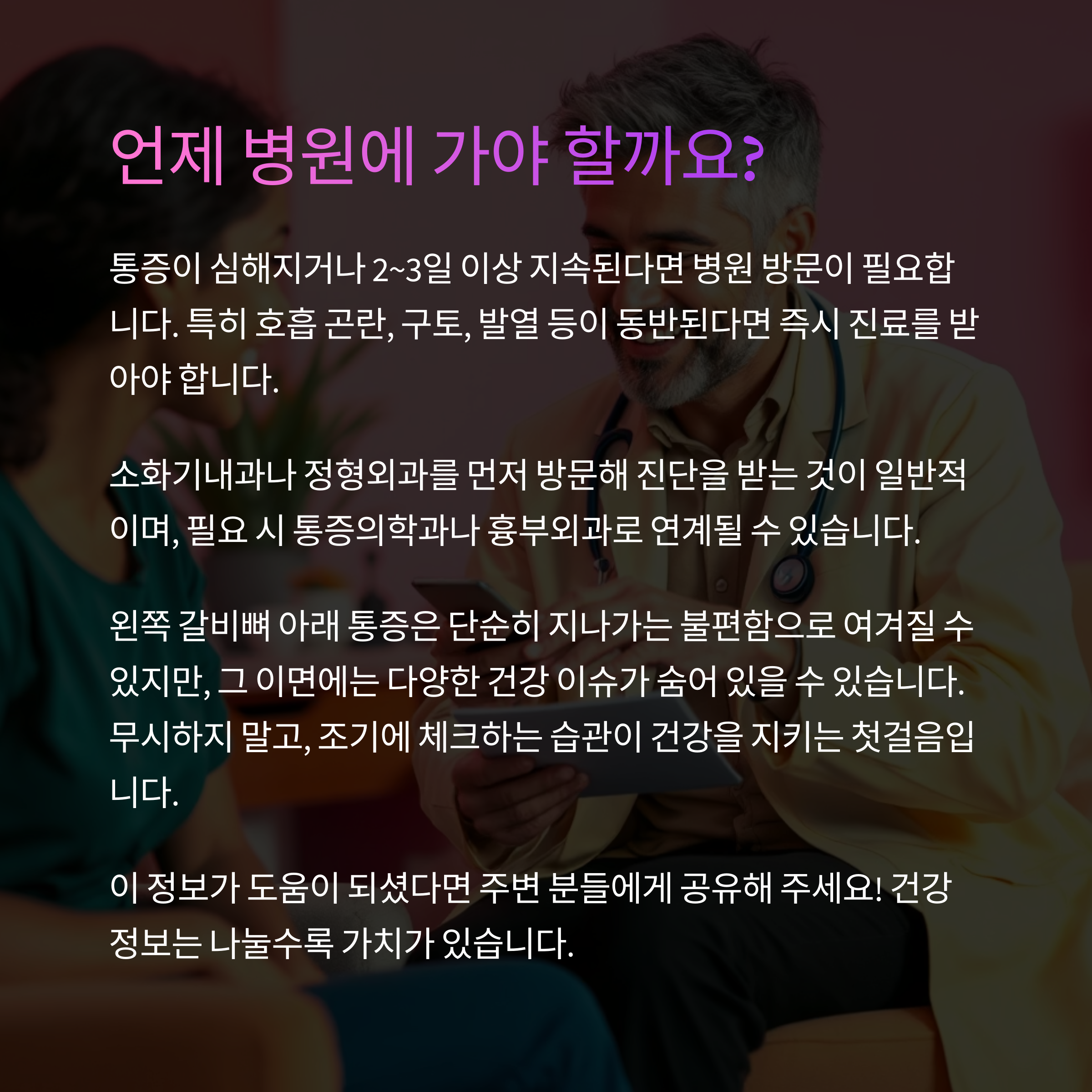 통증이 심해지거나 2~3일 이상 지속된다면 병원 방문이 필요합니다.