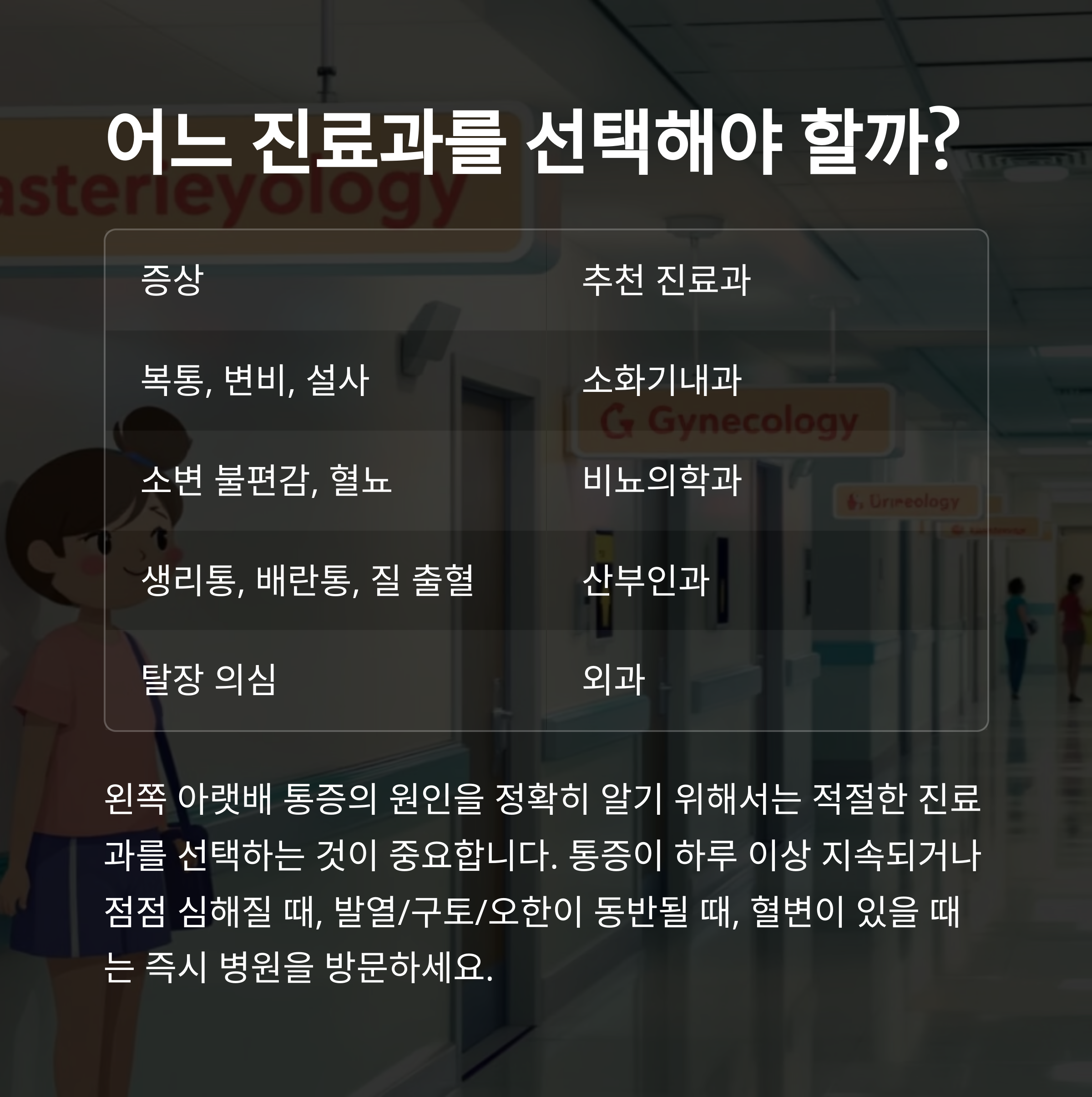 왼쪽 아랫배 통증의 원인을 정확히 알기 위해서는 적절한 진료과를 선택하는 것이 중요합니다.