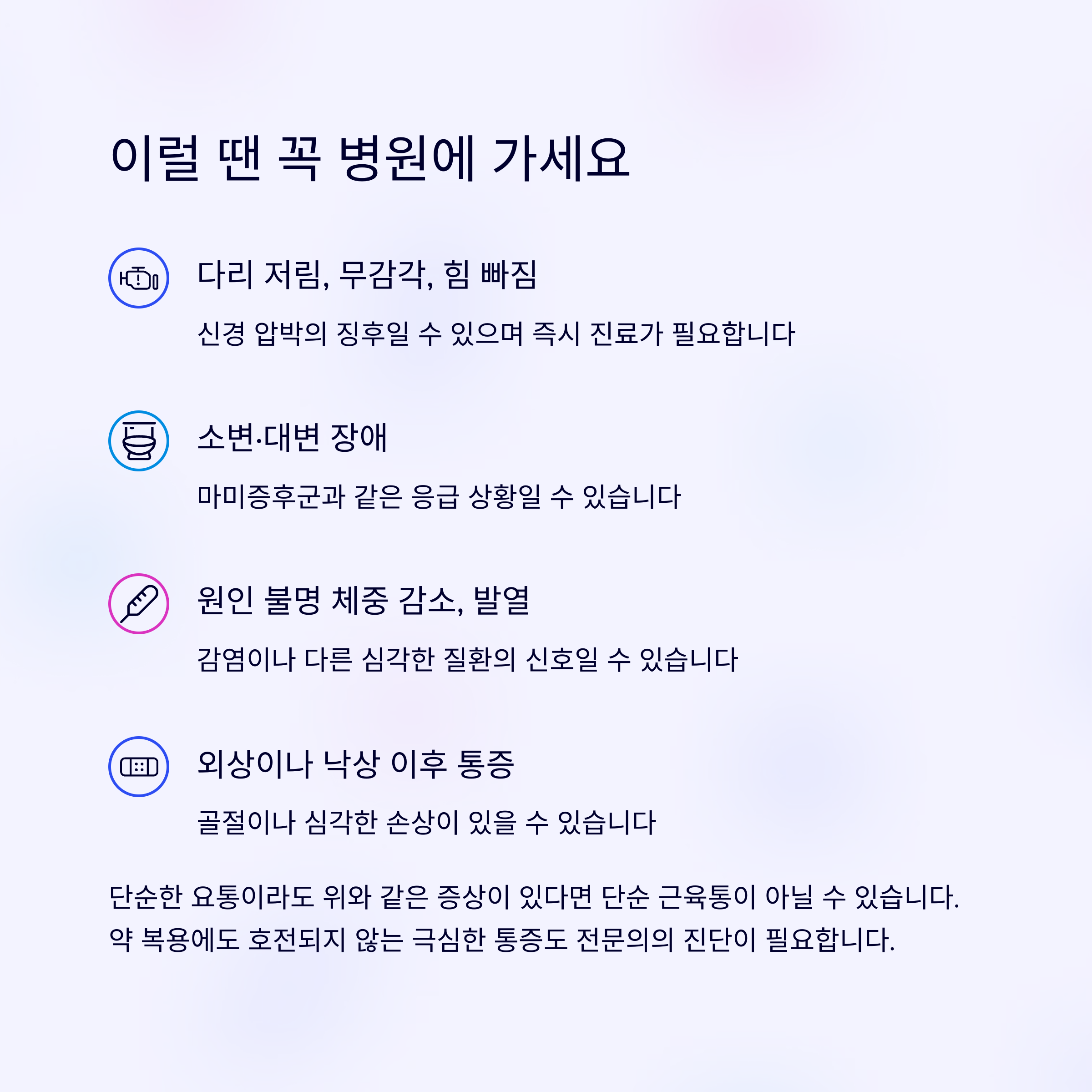 다리 저림이나 배뇨 장애, 낙상 이후 통증 등이 있다면 즉시 전문의 진료가 필요합니다.