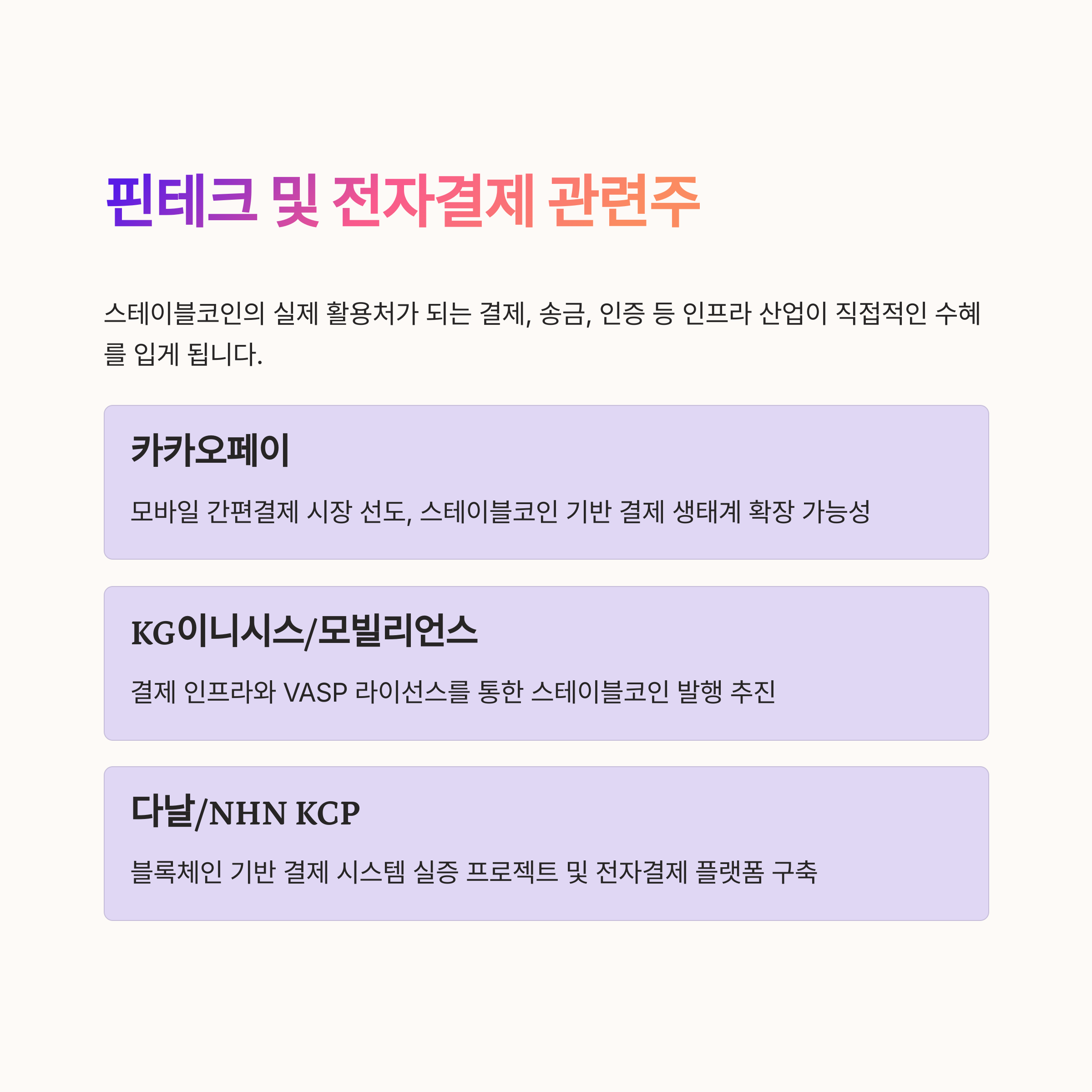 • 카카오페이: 모바일 간편결제 시장을 선도하며, 스테이블코인 기반 결제 생태계 확장 가능성