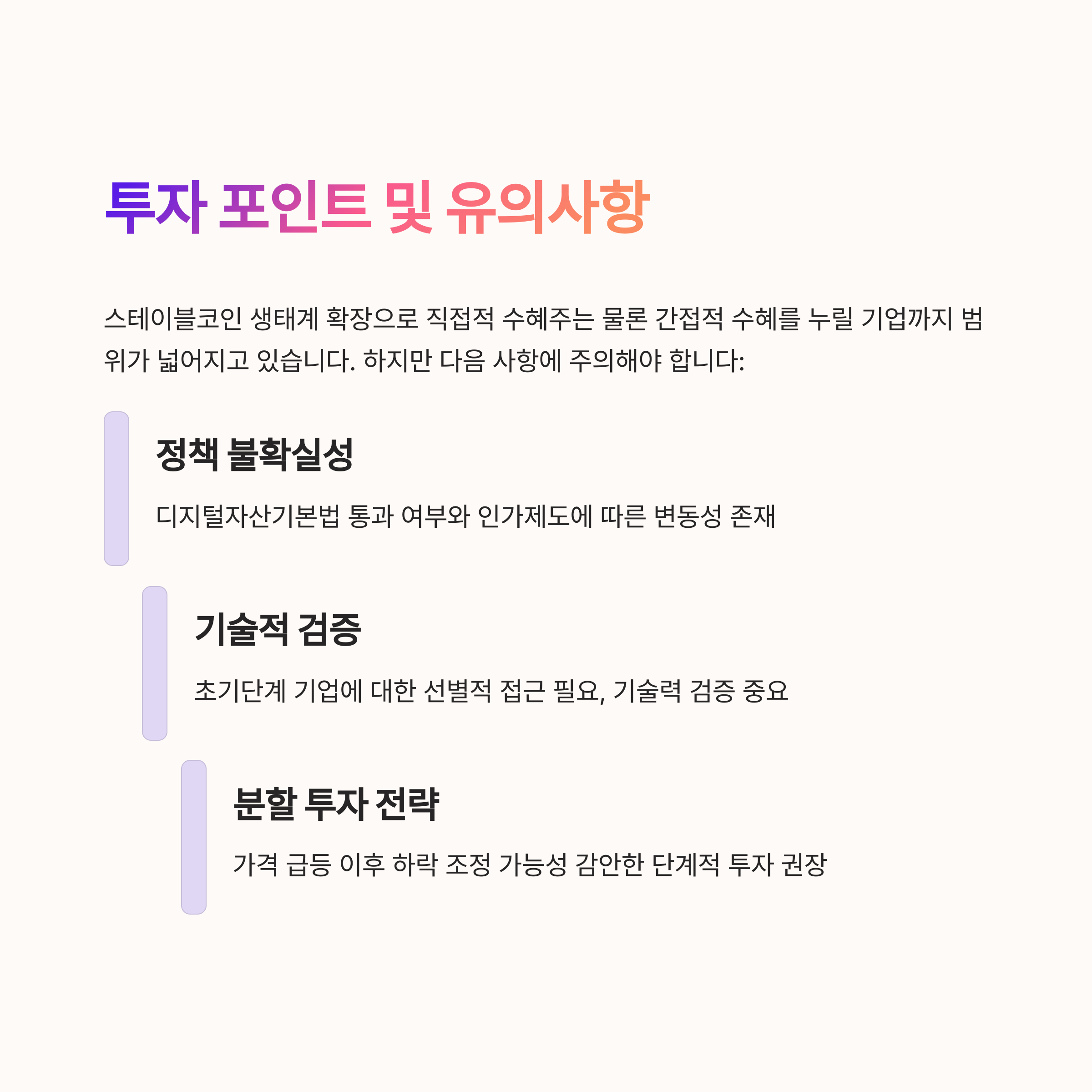스테이블코인 생태계가 확장됨에 따라 직접적 수혜주는 물론 간접적 수혜를 누릴 기업까지 범위가 넓어지고 있습니다.