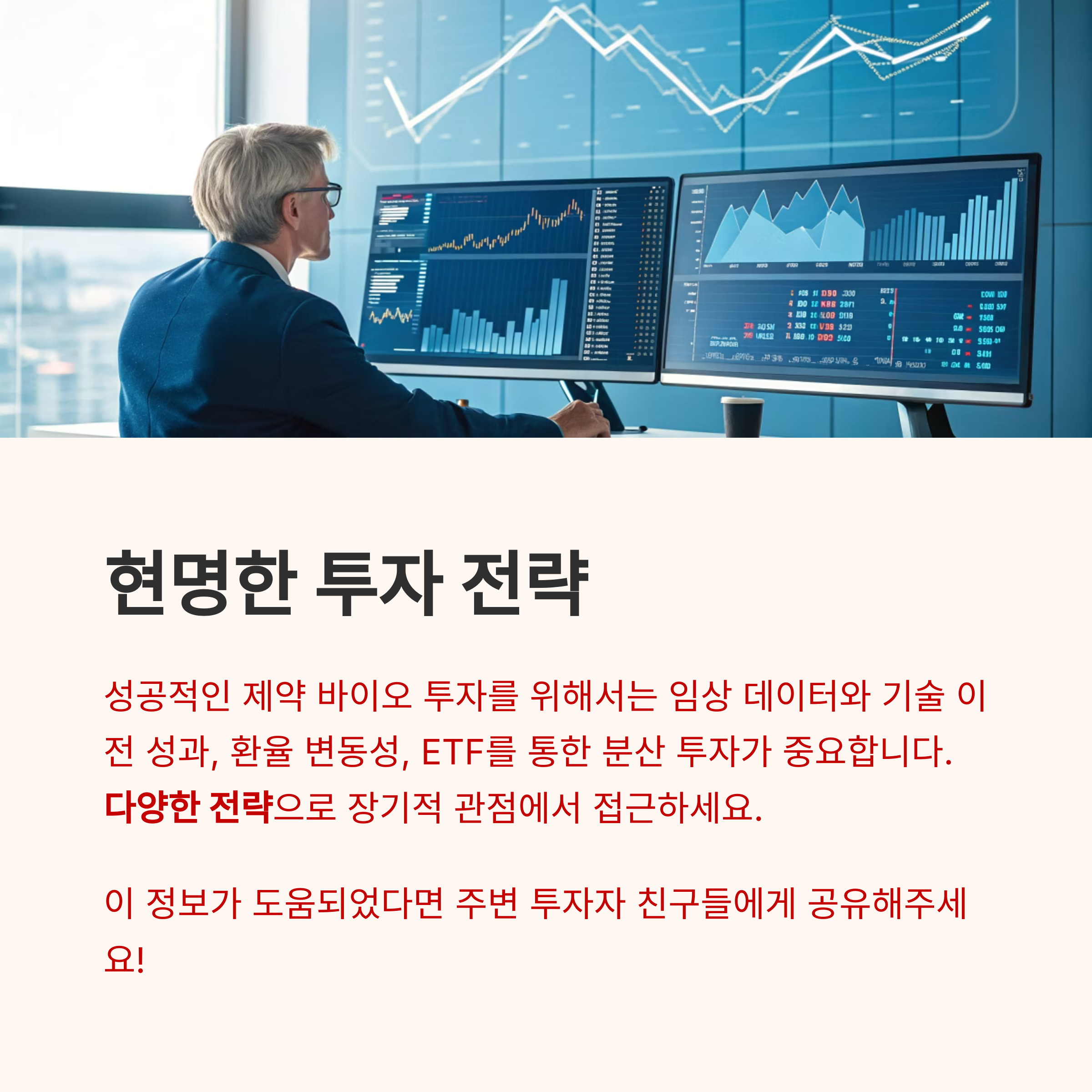임상 실패, 규제 거절 같은 이슈가 있으므로 분산 투자와 장기 관점 유지가 중요합니다.