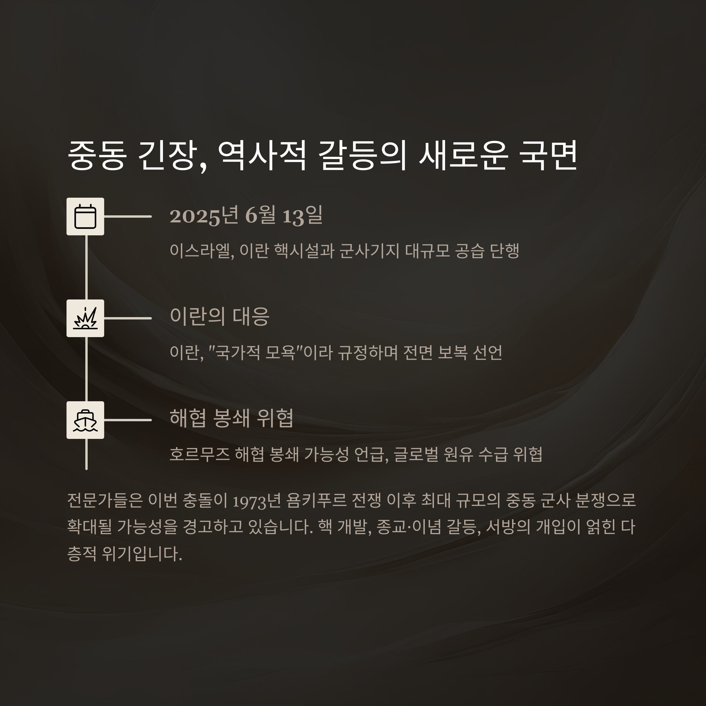 2025년 6월 13일, 이스라엘이 이란의 핵시설과 군사기지를 공습하면서 긴장은 최고조에 달했고,