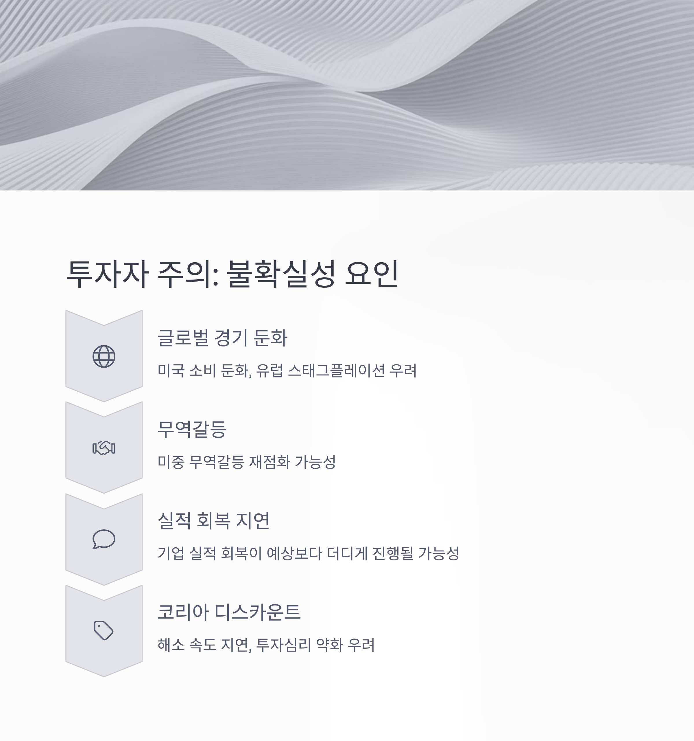 글로벌 경기 둔화, 금리 불확실성, 기업 실적 부진, 지정학적 리스크 등이 투자 판단을 어렵게 만들 수 있습니다.