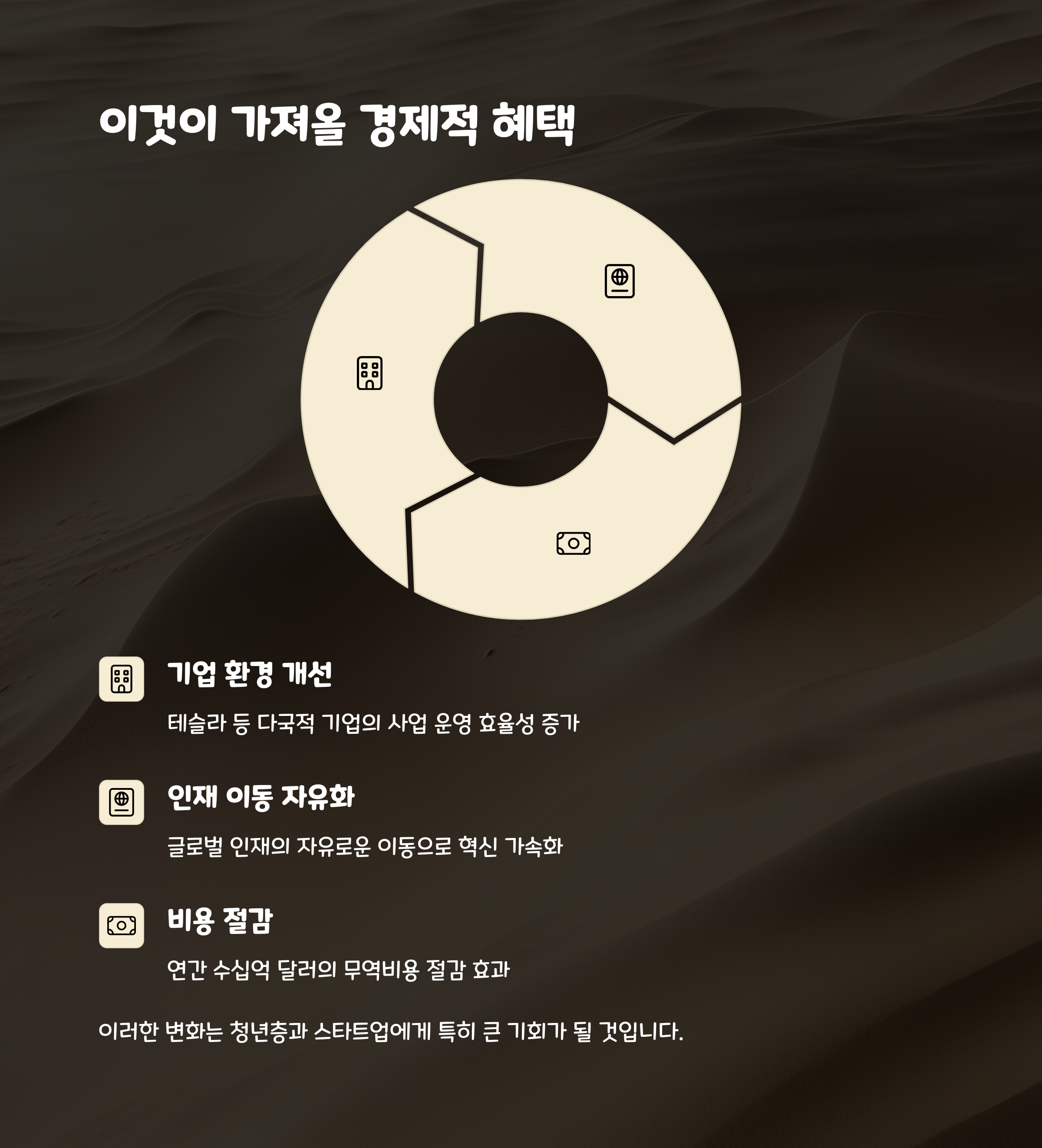 이는 테슬라, 스페이스X, 뉴럴링크 등을 이끄는 글로벌 경영자이기에 가능한 시각이자 전략이기도 합니다. 자유무역과 인력 이동이 현실화되면 무역비용 절감, 글로벌 인재 확보, 시장 확장 등 다양한 이점이 뒤따릅니다. 특히 청년 구직자, 해외 취업 준비생, 글로벌 스타트업 창업자들에게 기회의 지형도가 바뀔 수 있는 중요한 전환점이 될 수 있습니다. 정치적 현실은 복잡하지만, 지금 이 논의가 등장했다는 사실 자체가 매우 큰 의미를 지니며, 미래를 준비하는 이들에게 강력한 시사점을 던져줍니다.