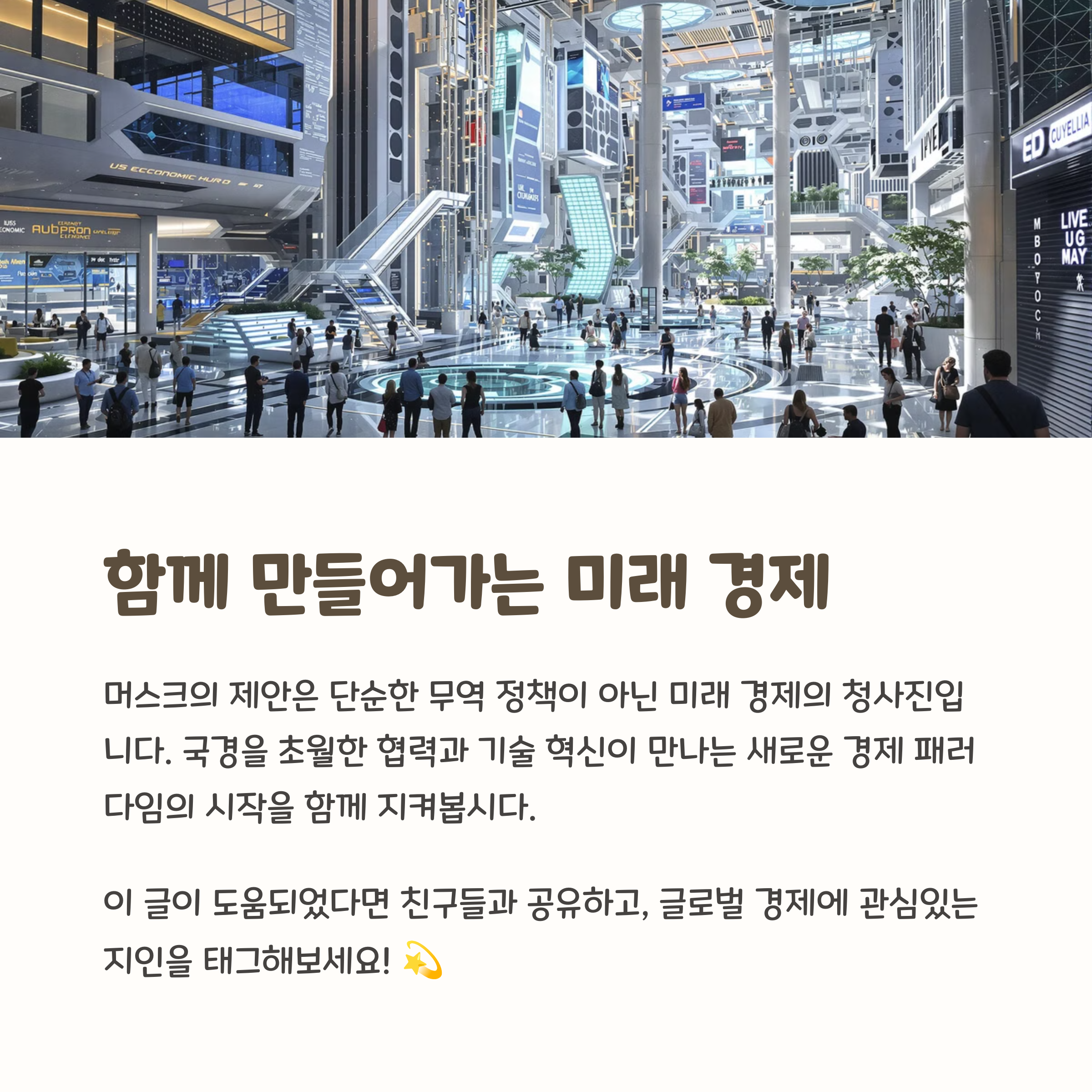 이번 제안이 현실화될 수 있을지는 미지수입니다. 보호무역을 선호하는 정치 분위기, 이민 정책에 대한 보수적 시각, 그리고 각국의 산업 이해관계가 복잡하게 얽혀 있기 때문입니다. 하지만 이런 논의가 수면 위로 떠오르고 있다는 점은 충분히 주목할 만합니다. 미래는 늘 오늘의 상상에서 시작되며, 이번 머스크의 제안은 그 시작점이 될 수도 있습니다. 지금은 설득의 시간이자, 각계각층이 토론할 기회의 순간일지도 모릅니다.