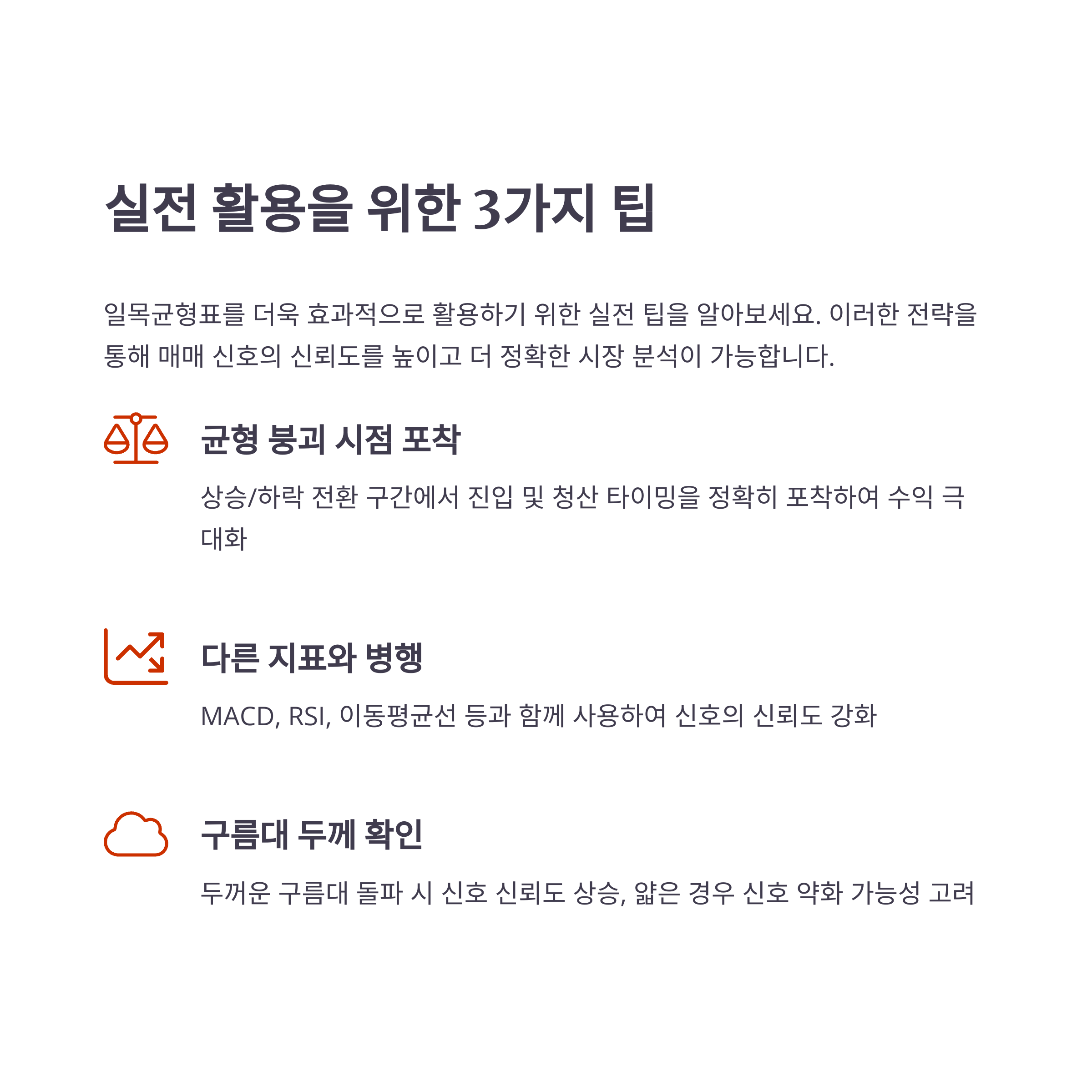 지금까지 일목균형표의 핵심 개념과 대표적인 매매기법, 실전에서 활용할 수 있는 팁까지 함께 살펴보았습니다.