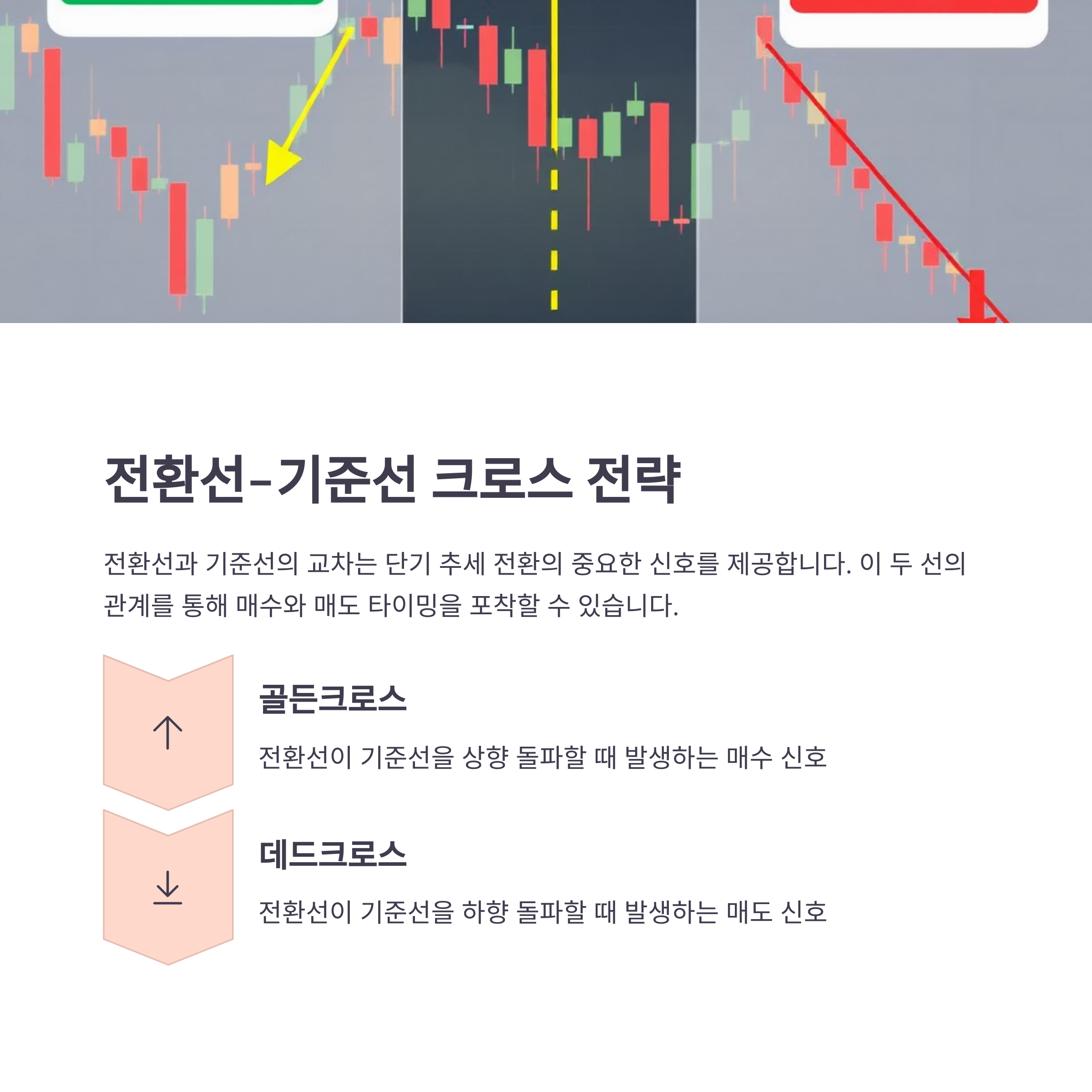 전환선이 기준선을 상향 돌파하는 경우 이를 골든크로스로 보아 매수 신호로 해석하며, 반대로 하향 돌파할 경우 데드크로스로 인식하여 매도 신호로 받아들입니다.