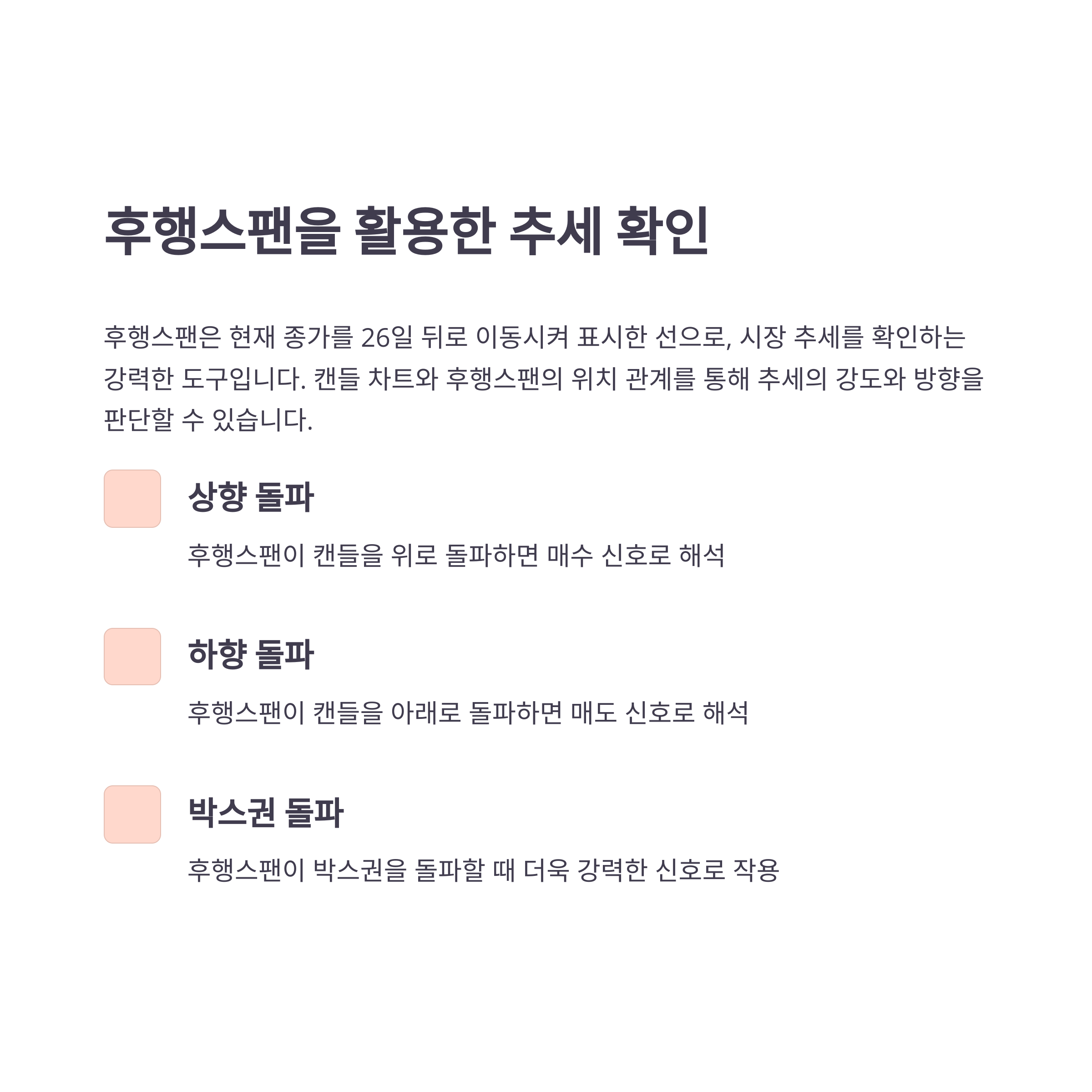 후행스팬이 캔들을 상향 돌파하면 매수 신호, 하향 돌파하면 매도 신호로 간주됩니다. 특히 박스권 돌파 시에는 더 강력한 신호로 작용하는 경우가 많습니다.