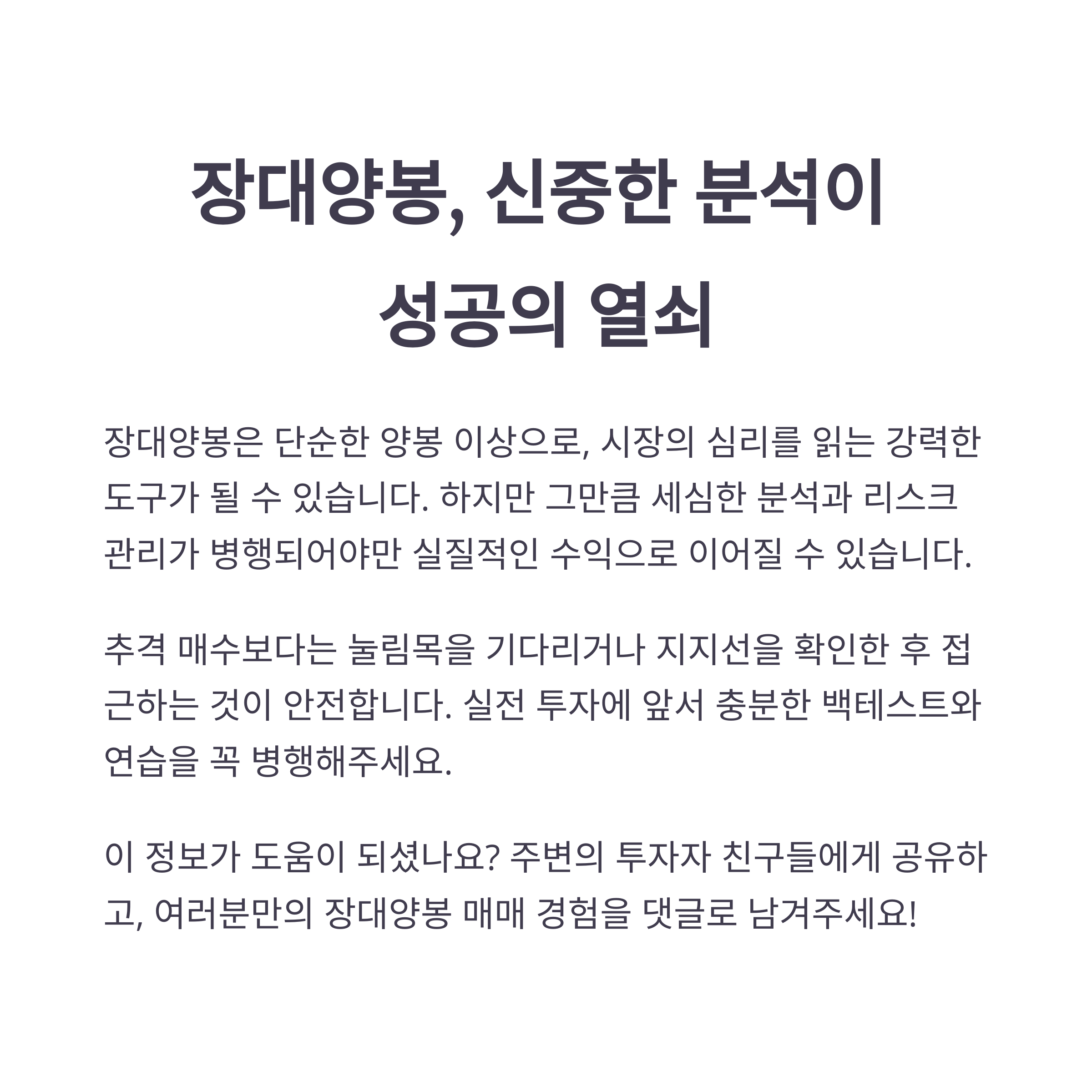 장대양봉은 단순한 양봉 이상으로, 시장의 심리를 읽는 강력한 도구가 될 수 있습니다.