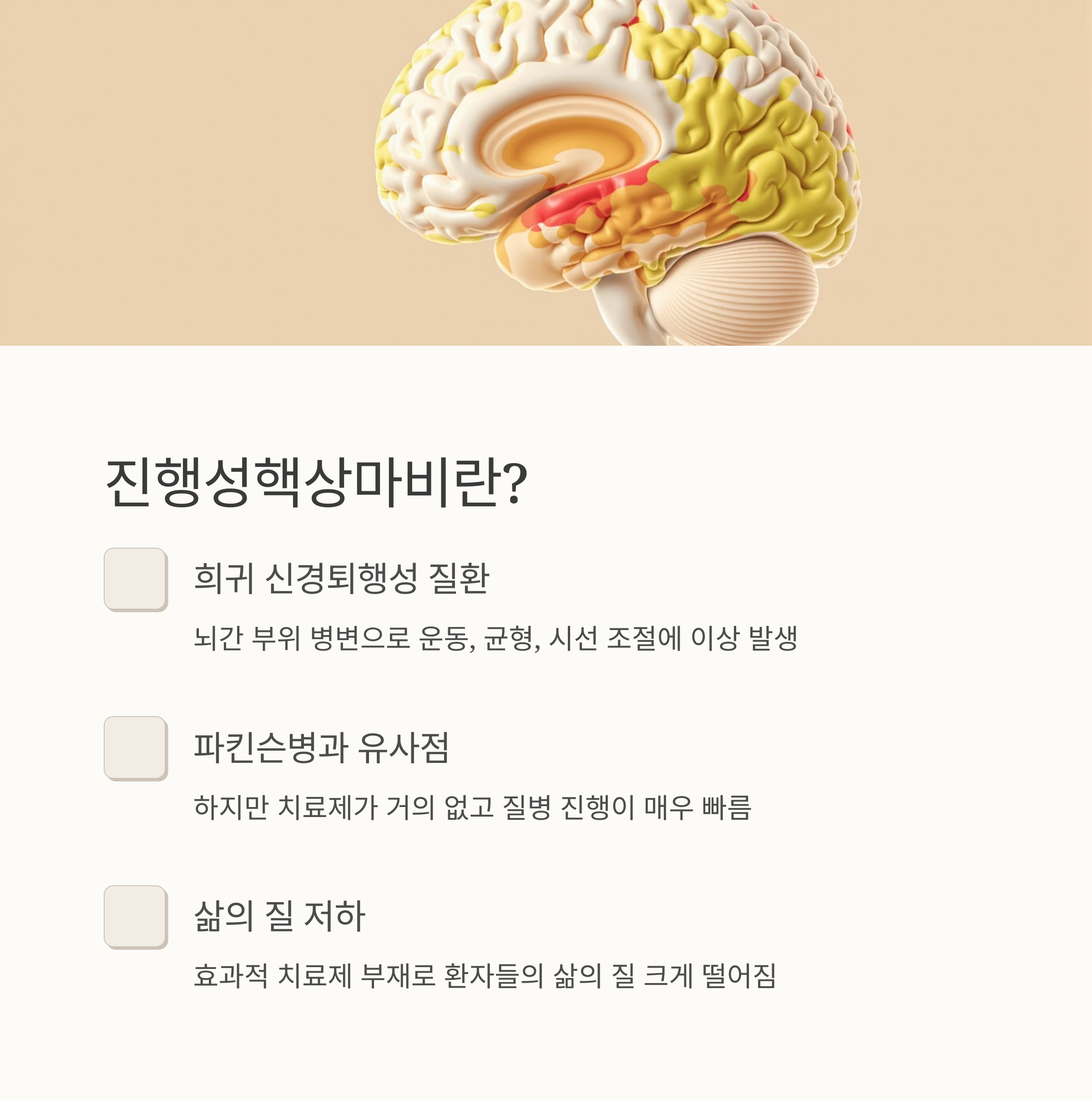 진행성핵상마비(PSP, Progressive Supranuclear Palsy)는 뇌간 부위에 병변이 생기며 운동 능력, 균형, 시선 조절, 인지 기능 등에 이상이 나타나는 희귀 신경퇴행성 질환입니다.