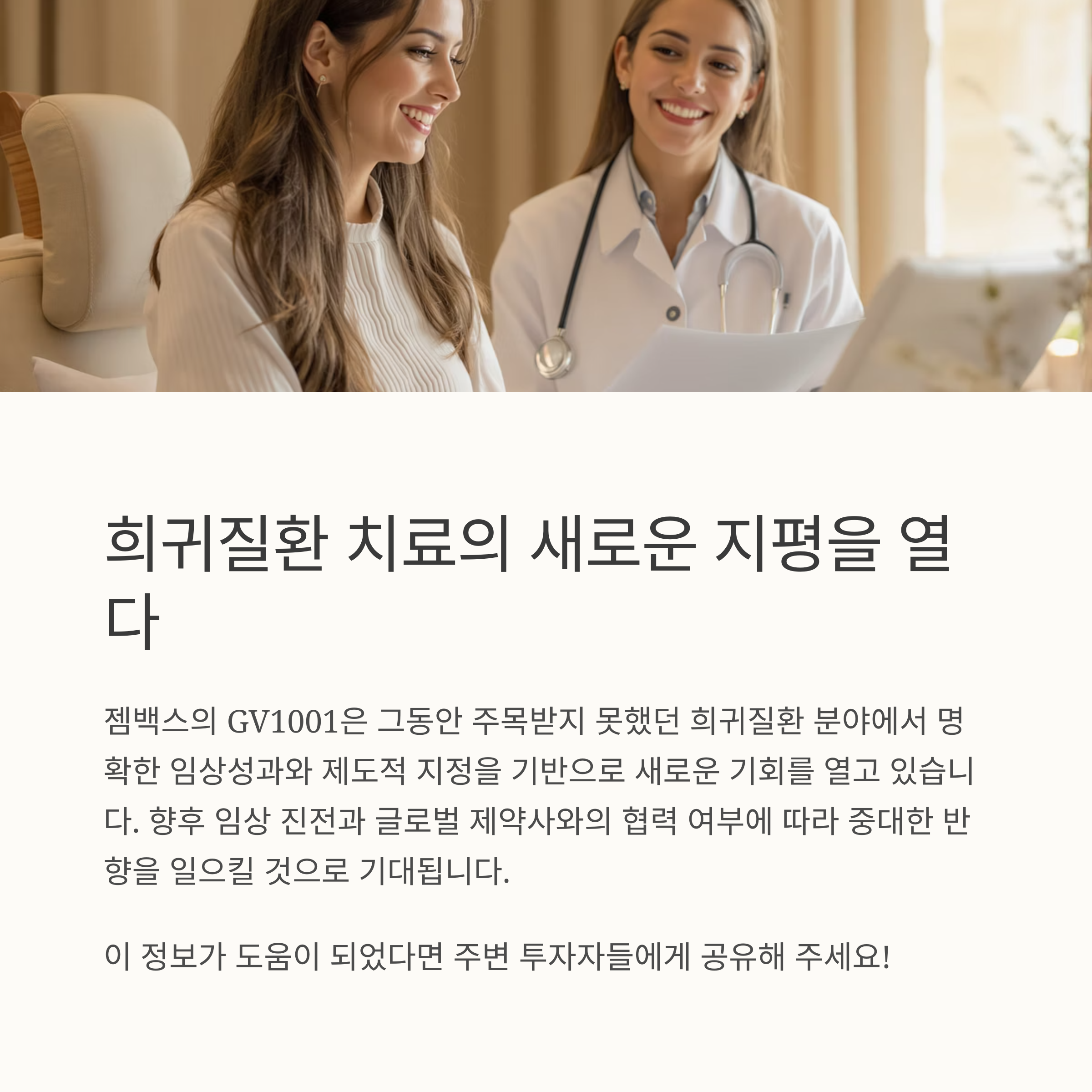 젬백스의 GV1001은 그동안 주목받지 못했던 희귀질환 분야에서 명확한 임상성과와 제도적 지정을 기반으로 새로운 기회를 열고 있습니다.