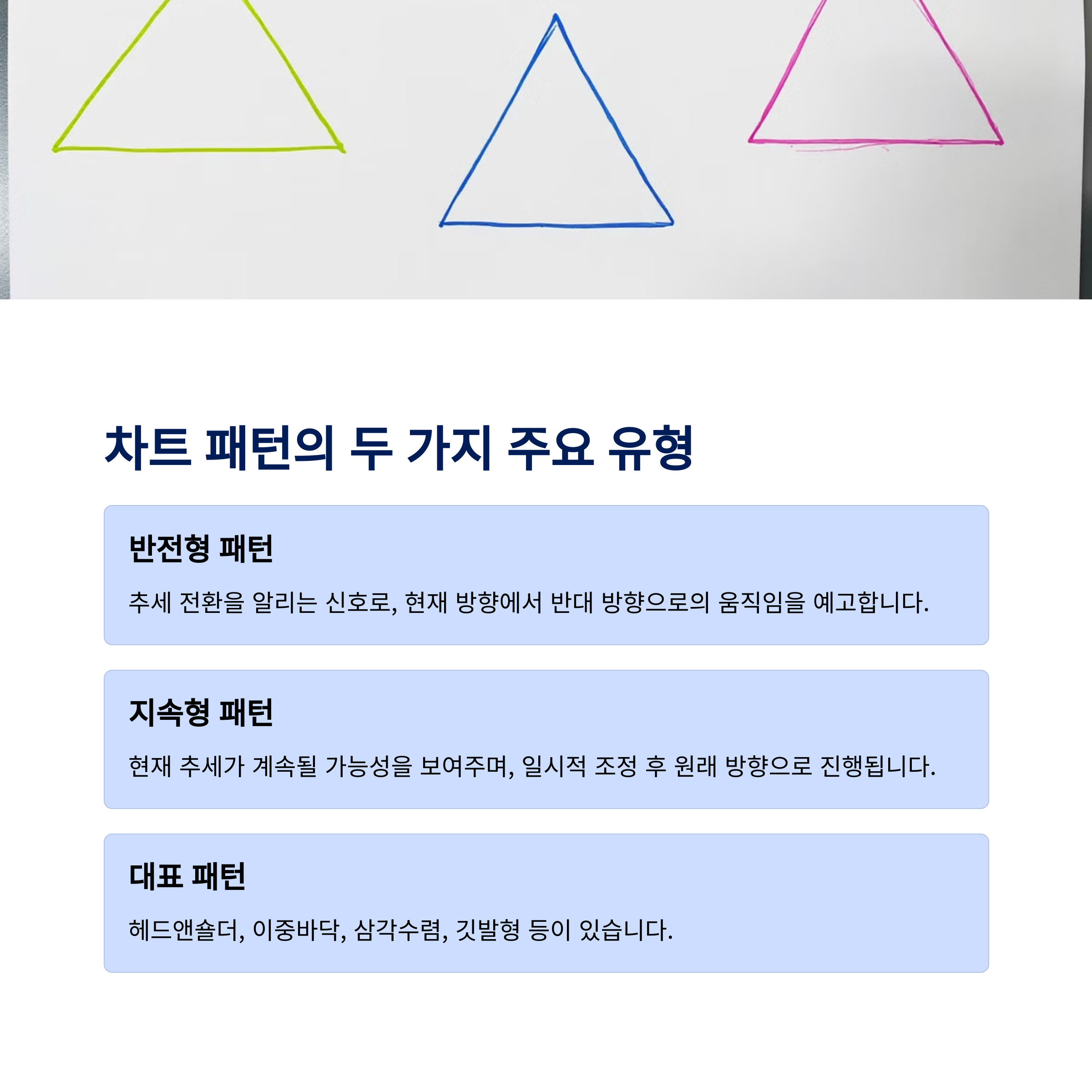 | 차트 패턴이란? | 주가의 움직임이 일정한 형태로 반복될 때 나타나는 시각적 패턴으로, 투자자 심리와 추세 전환 시점을 파악하는 데 사용 |