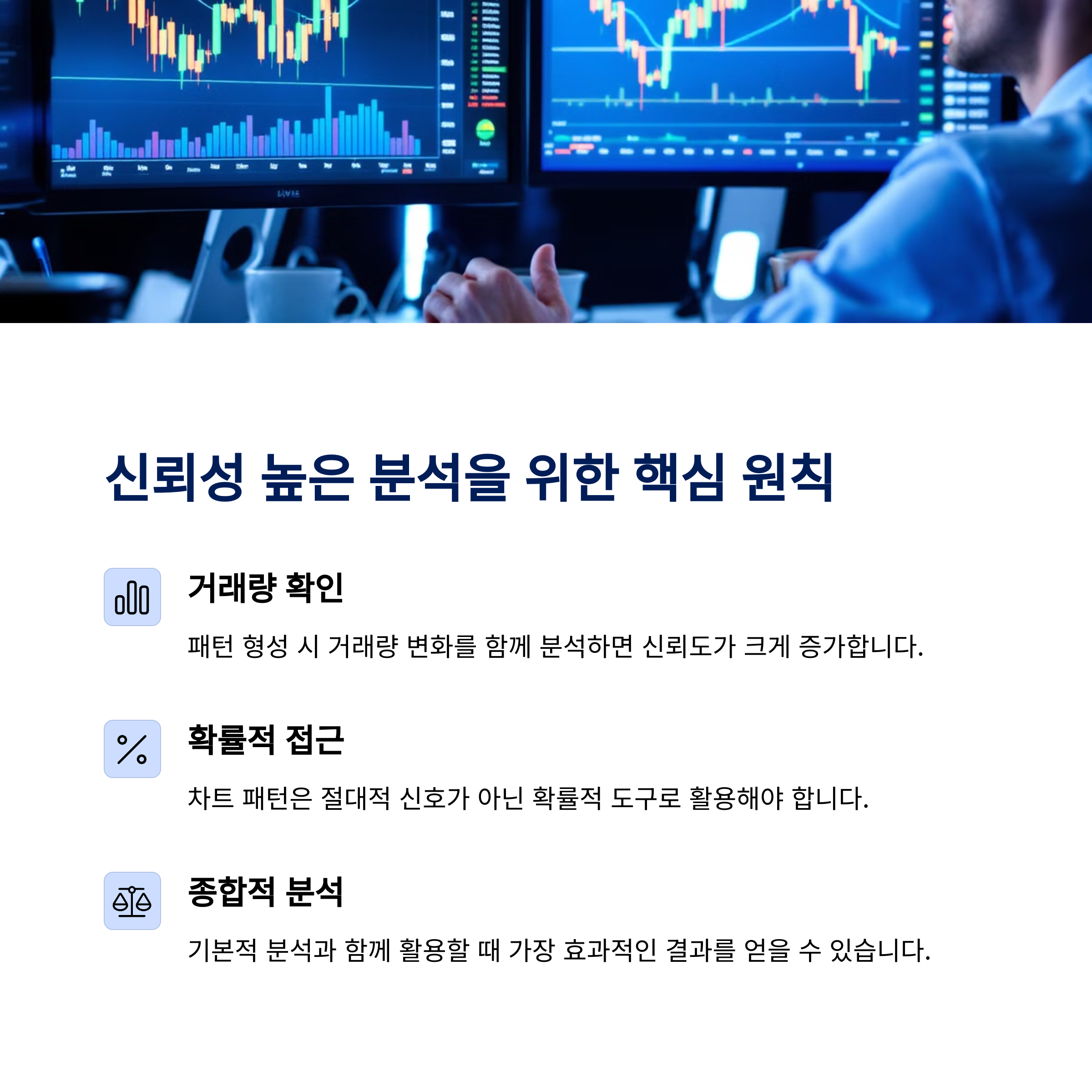 | 헤드앤숄더, 이중바닥, 이중천장, 쐐기형 등 추세 전환 시 출현 | 삼각수렴, 깃발형, 박스권, 페넌트 등 추세 유지 시 나타남 | 거래량, 이탈 방향, 캔들 패턴과 함께 분석하여 정확도 향상 |