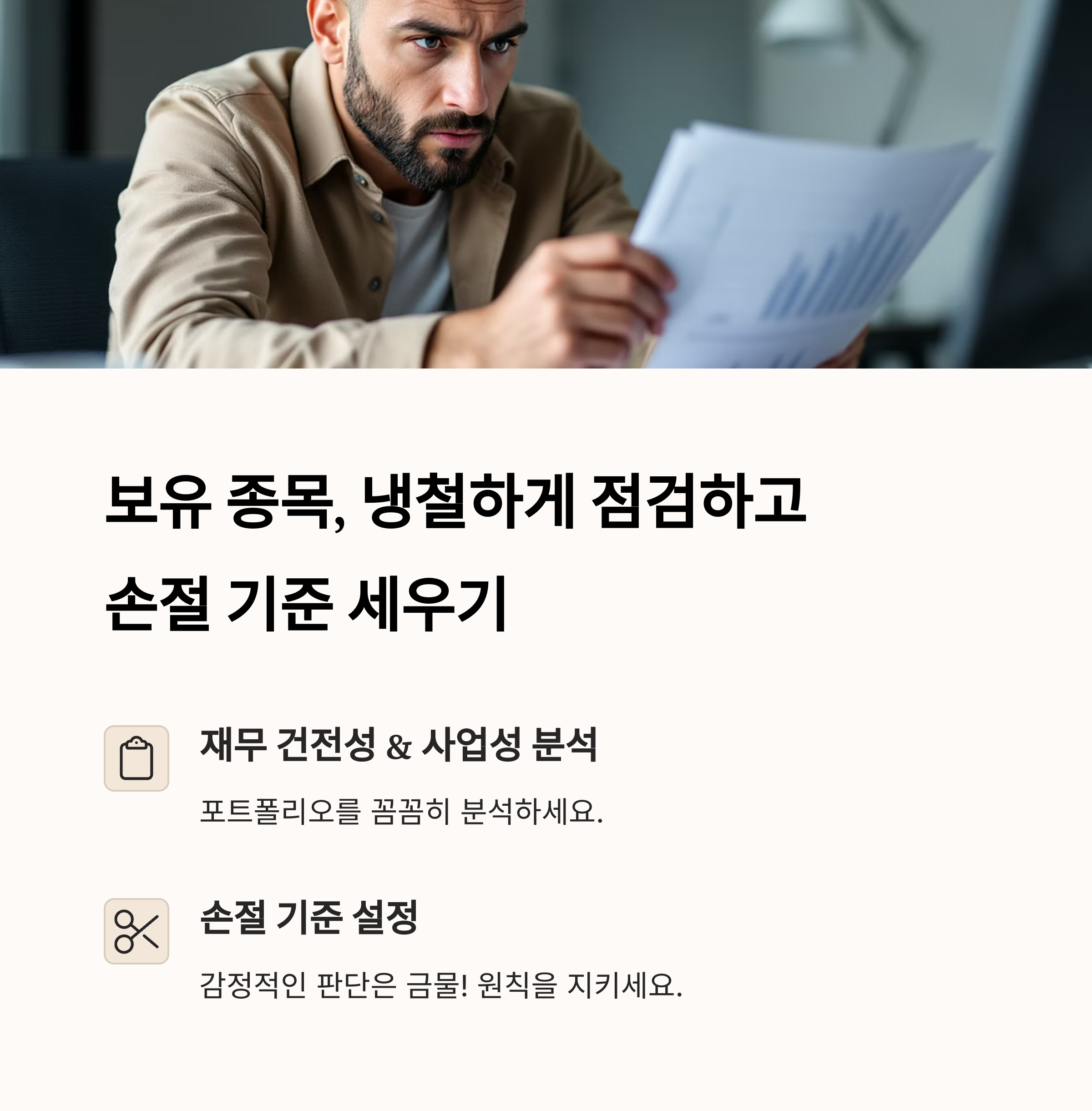 급변 시장에서의 손실 최소화를 위해서는 현재 보유 중인 종목의 내재 가치와 변동성 수준을 철저히 재점검해야 합니다. 특히 매수 근거가 사라졌거나 업황이 극단적으로 악화된 종목은 과감한 조정이 필요합니다.
