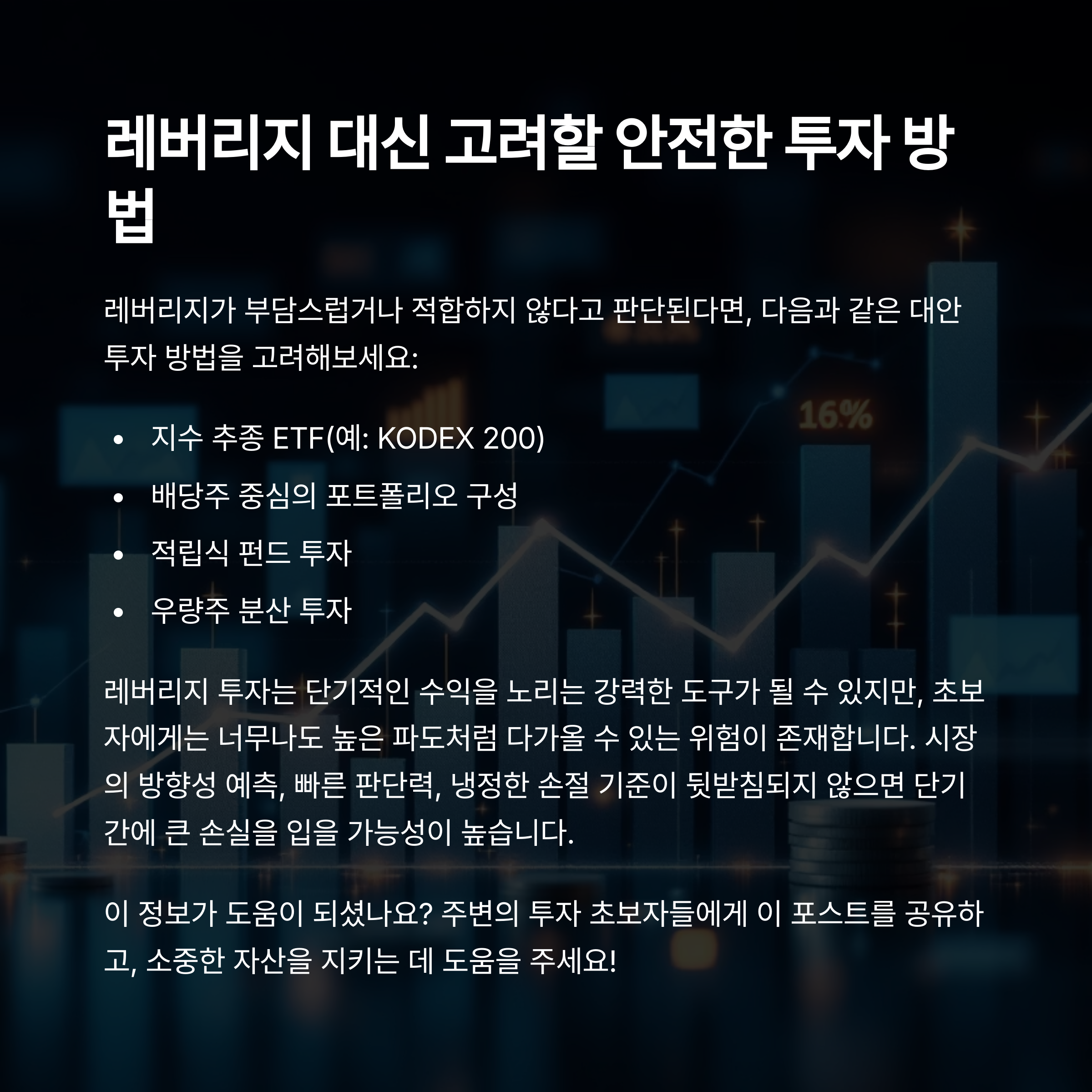 레버리지가 부담스럽거나 적합하지 않다고 판단된다면, 다음과 같은 대안 투자 방법을 고려할 수 있습니다.