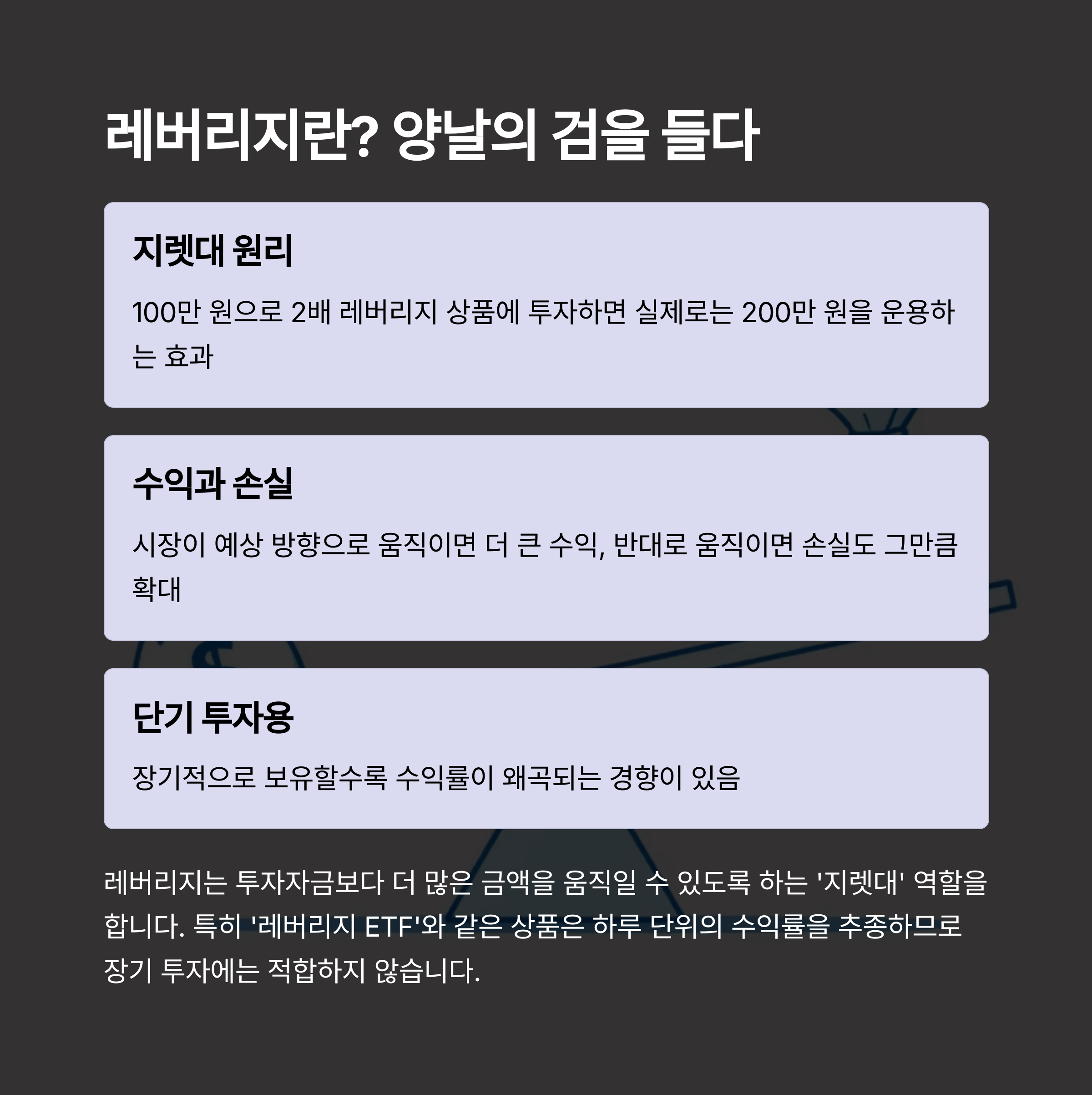 예를 들어, 100만 원으로 2배 레버리지 상품에 투자하면 실제로는 200만 원을 운용하는 효과를 냅니다.