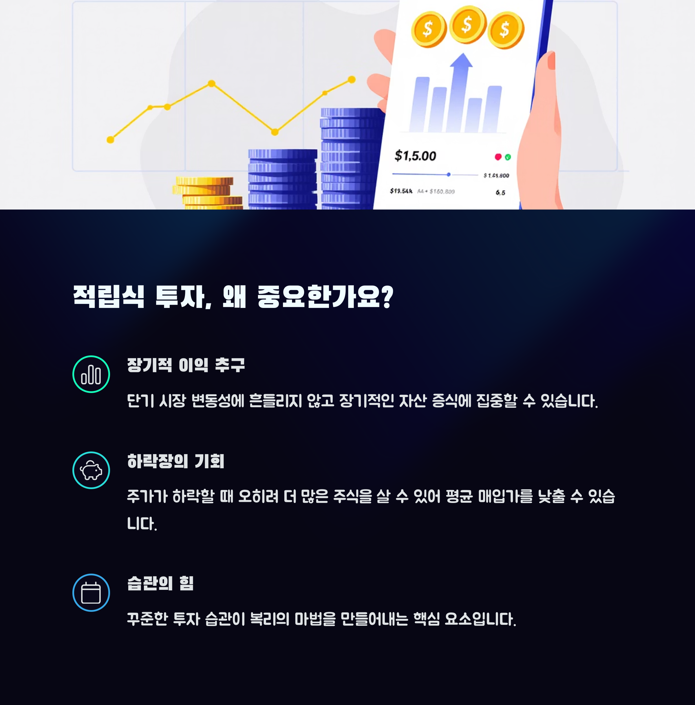 | 왜 중요한가? | 타이밍 예측 대신 꾸준한 투자 습관을 형성하고, 평균 매입 단가를 낮춰 장기 수익률을 개선할 수 있기 때문입니다. |