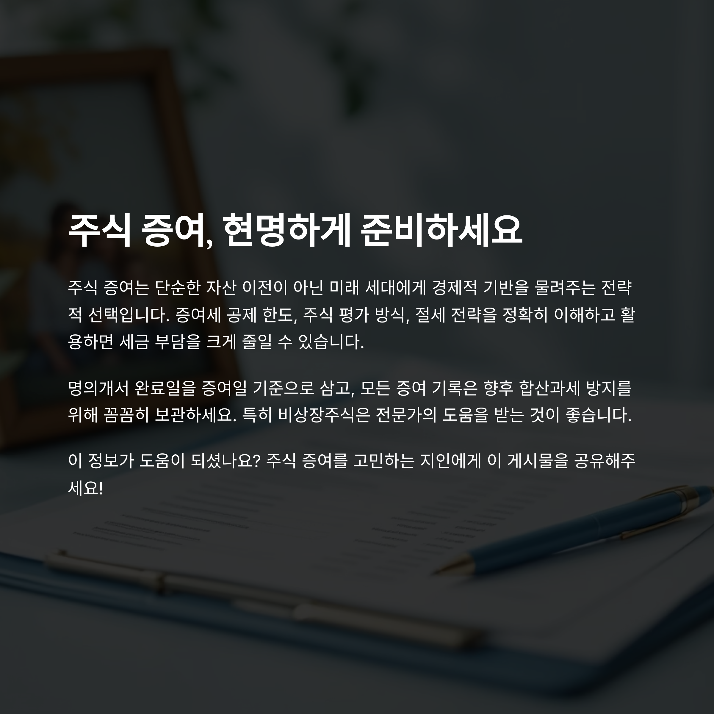 주식 증여는 단순한 자산 이전이 아니라, 미래 세대에게 경제적 기반을 물려주는 전략적인 선택이 될 수 있습니다.