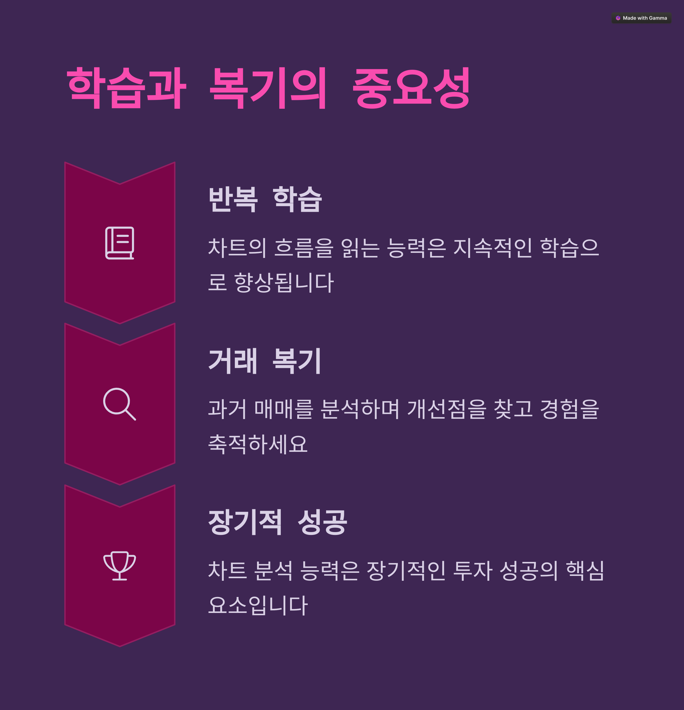 | 5일, 20일, 60일선 등을 종합적으로 분석하세요. | 거래량 급증은 방향 전환의 전조가 될 수 있습니다. | 과거 차트를 자주 복기하며 패턴을 익히세요. |